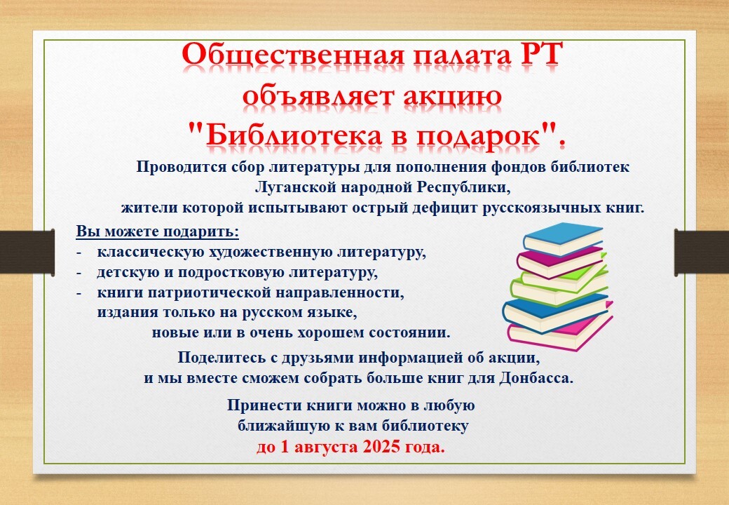 Читатели Центральной детской библиотеки им.С.В.Михалкова, Кошкинской сельской библиотеки, Лубянской сельской библиотеки и Манзарасской модельной сельской библиотеки присоединились к акции «Библиотека в подарок», которую организовала Общественная палата РТ. Благодарим всех принявших участие в благотворительной акции! Напоминаем, что книги принимаются в библиотеках района до 1 августа 2025 года.