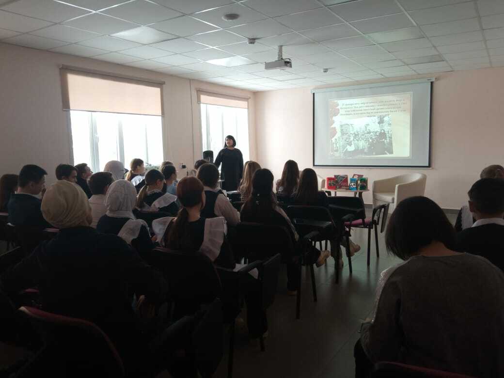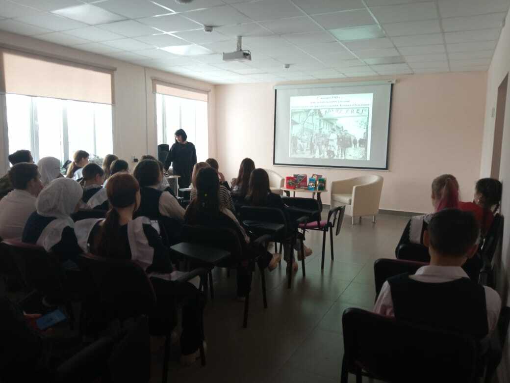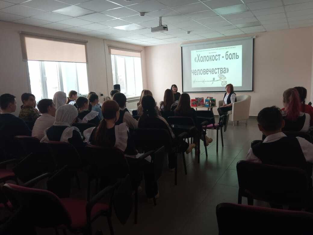 В канун этой памятной даты, библиотекарь центральной библиотеки Гарипова Л.Д., для учащихся 8 б класса МБОУ «Гимназия № 1 им. Ч.Т. Айтматова», провела час памяти: «Холокост - боль человечества». Лилия Дамировна познакомила учащихся с основными понятиями, связанными с трагедией Холокоста. Рассказала о многочисленных жертвах фашизма, о жестоком истреблении еврейского народа, которых массово уничтожали в лагерях смерти. Главной целью мероприятия было донести учащимся, что сегодня мы обязаны не только помнить о прошлом, но и четко осознавать, какие угрозы современному миру несут межнациональная рознь, расовая нетерпимость и пренебрежение к человеческому достоинству.