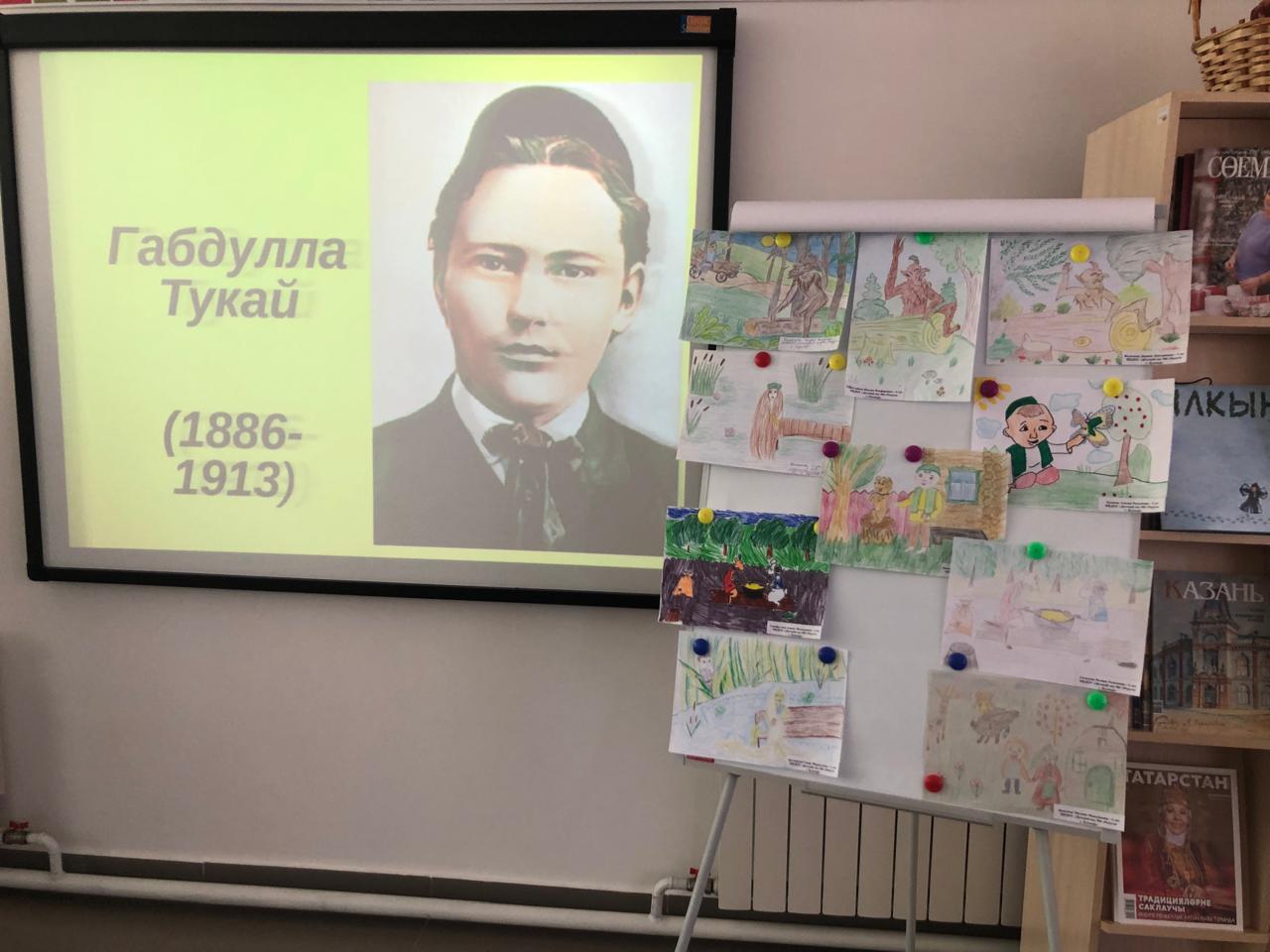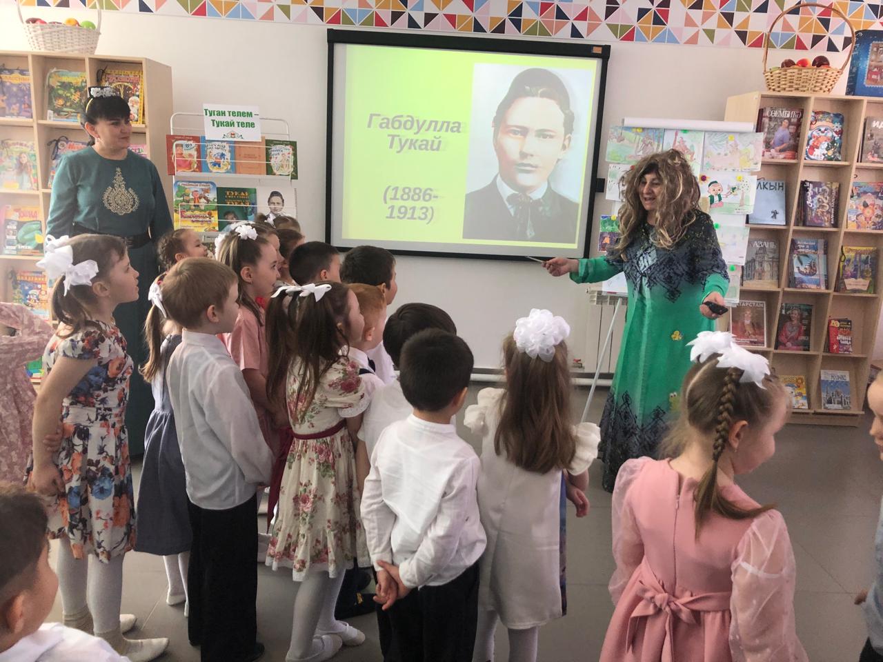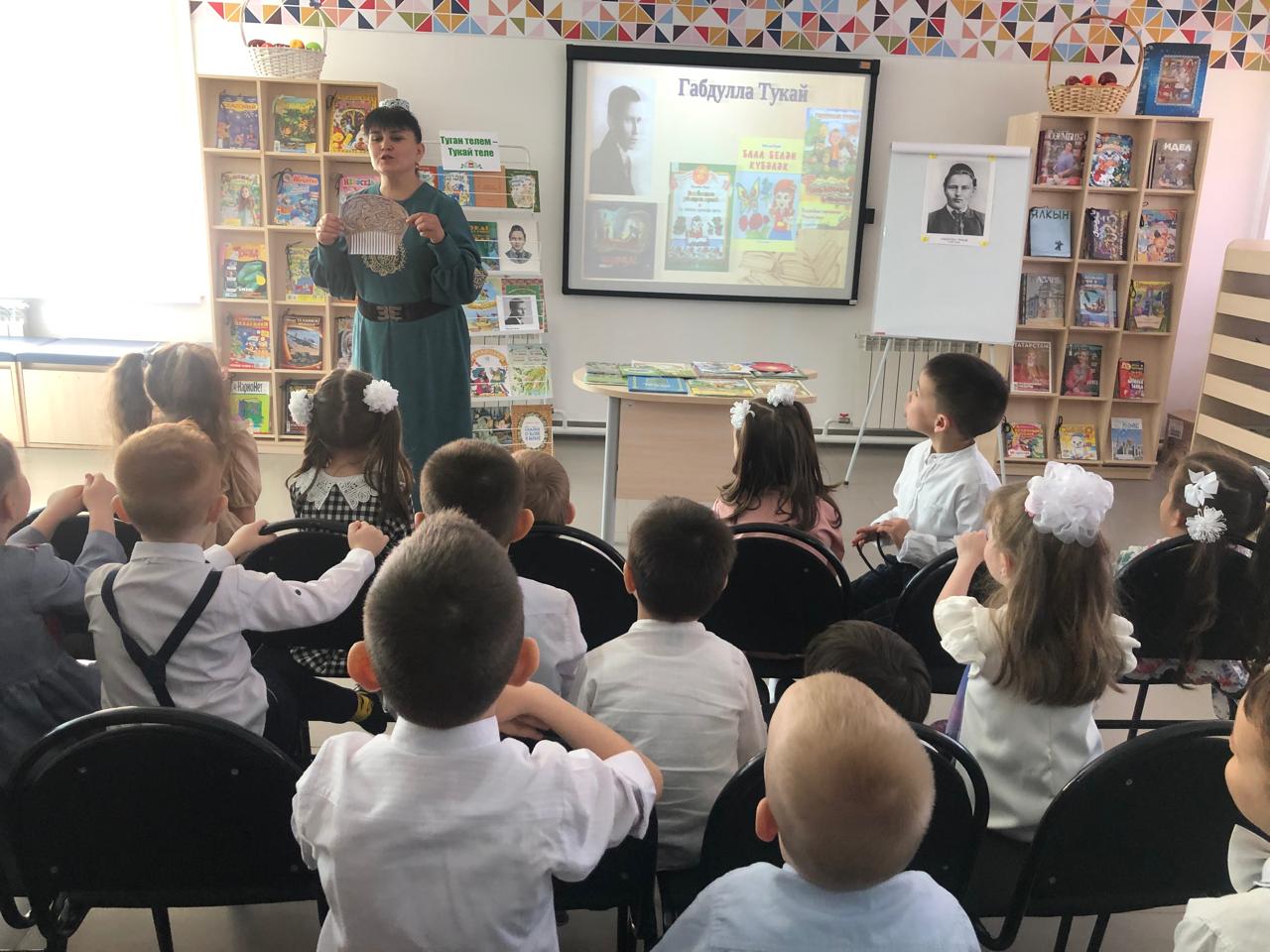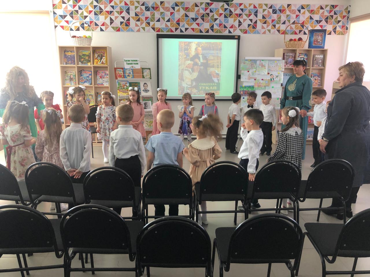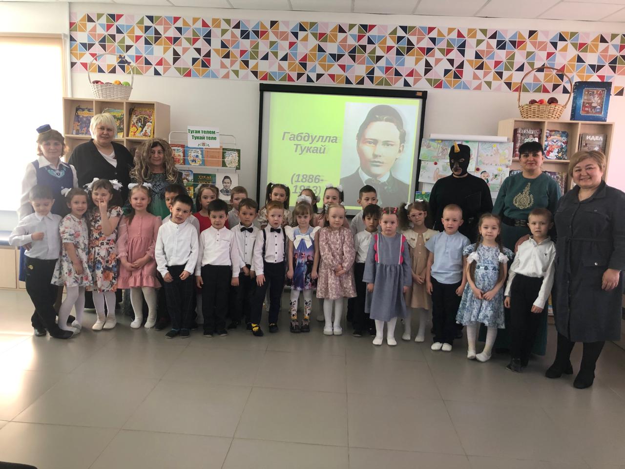 24 апреля центральная детская библиотека имени С.В.Михалкова совместно с детским садом «Радуга» провели конкурс стихов и рисунков «Тукай безнең күңелләрдә», посвящённый 139-летию со дня рождения татарского поэта Габдуллы Тукая. В конкурсе приняли участие дети старшей группы. Библиотекарь Закирова Фирдания рассказала о тяжелом детстве, о творческом пути поэта, познакомила с его книгами. К детям пришли персонажи сказок Тукая — Шурале и Су анасы, добавив празднику волшебства и радости. Дети выразительно читали стихотворения, воспевающие любовь к родному языку, родному краю, его природе, исполнили песни на слова Г.Тукая. Также они представили свои рисунки по произведениям поэта. Работы были выполнены с вдохновением, дети изобразили любимых сказочных героев. Все участники конкурса получили грамоты. Мероприятие завершилось исполнением песни “Туган тел”.