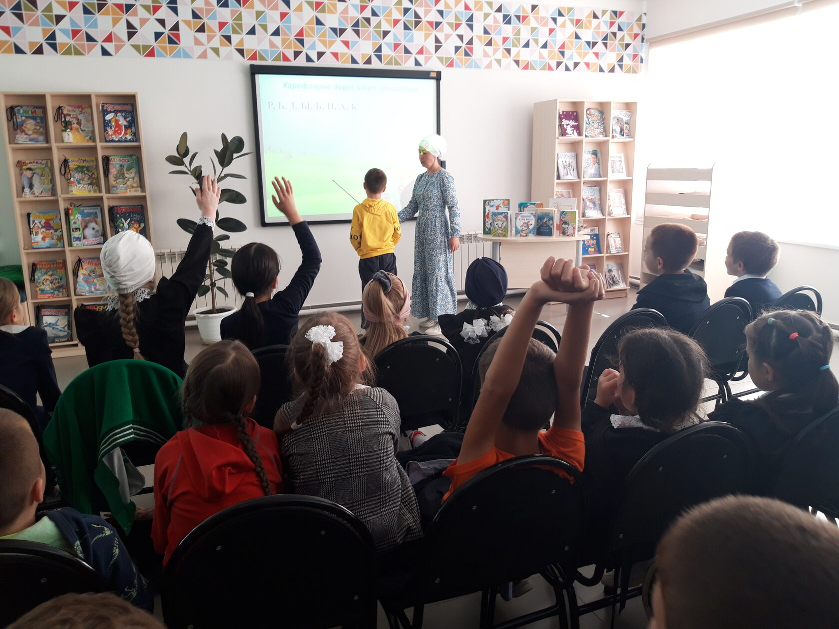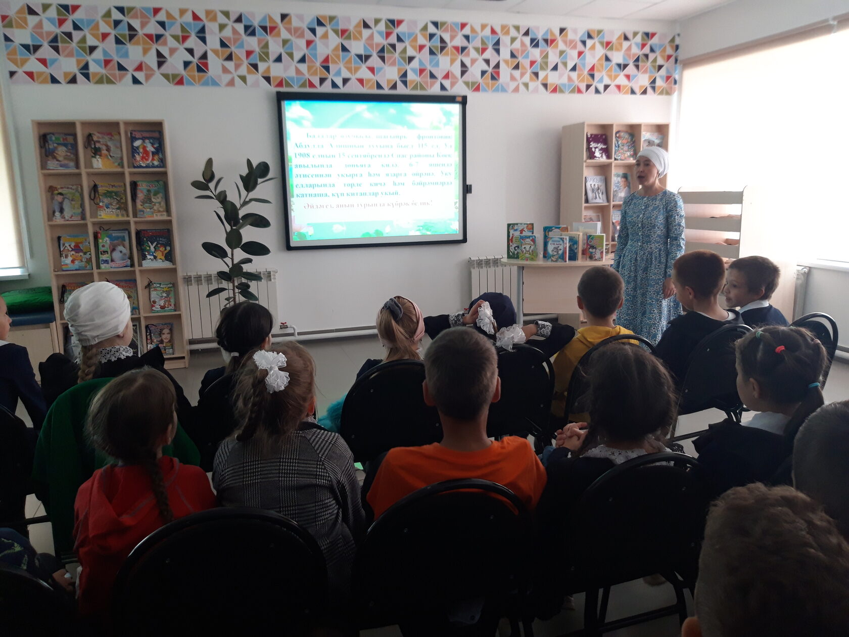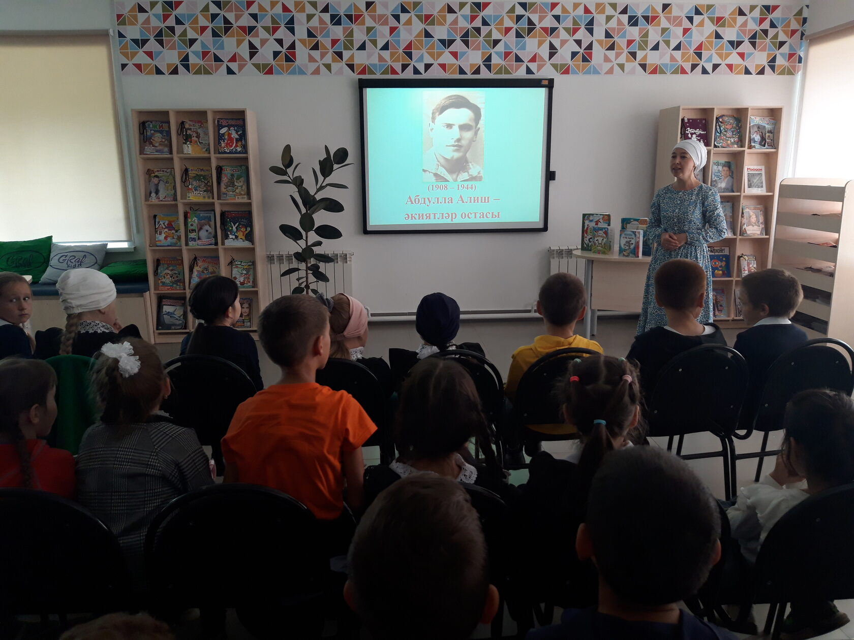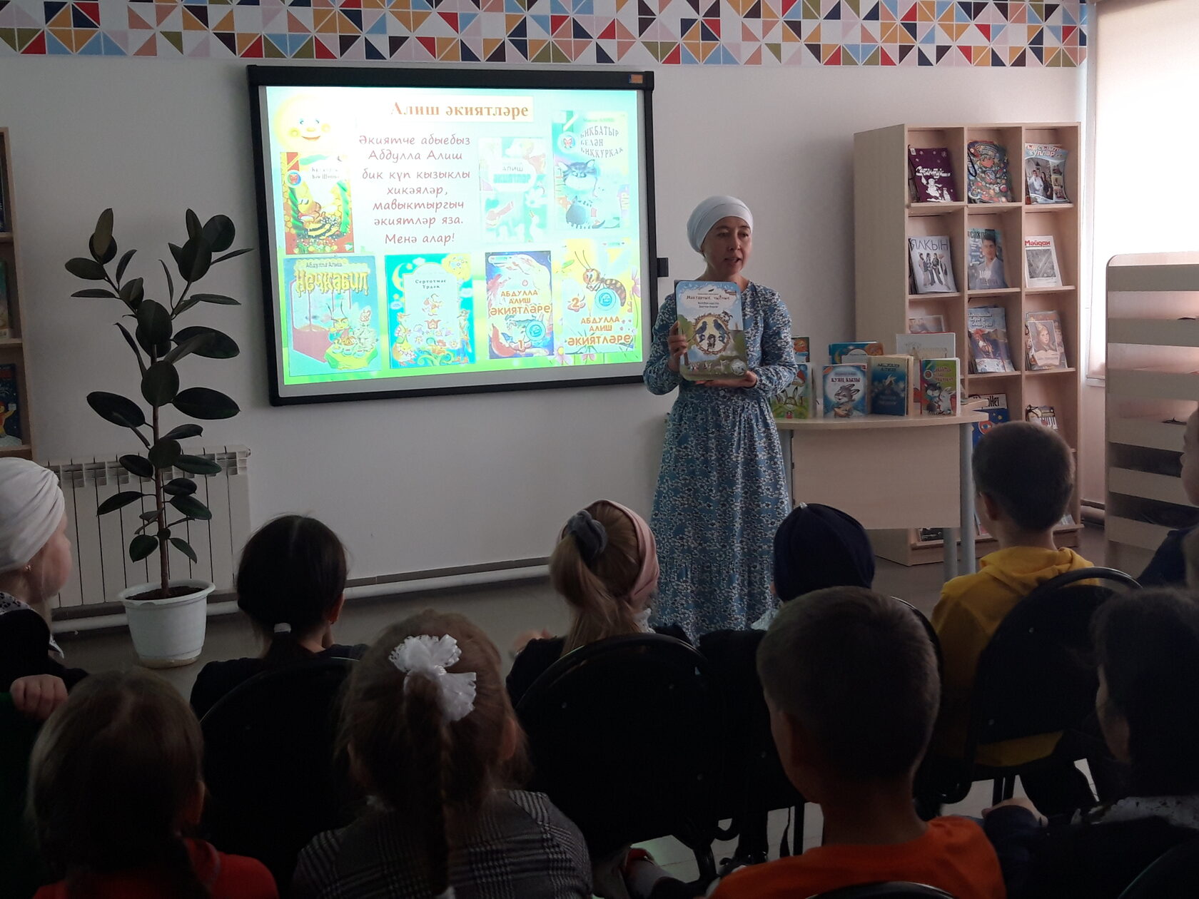 15 сентября в день рождения татарского писателя Абдуллы Алиша библиотекарь центральной детской библиотеки им.С.В.Михалкова Гарифуллина Рамзия для учащихся 2б класса Гимназии №1 им.Ч.Т.Айтматова провела литературный час «Абдулла Алиш – мастер сказок», посвященный 115-летию со дня рождения. Она познакомила детей с жизнью и творчеством писателя. Ребята вспомнили известные и любимые сказки автора, активно отвечали на вопросы викторины, разгадали кроссворд. Прочитали сказку «Тукмар белән Чукмар” и провели ее обсуждение. Мероприятие завершилось просмотром мультфильма по произведению Абдуллы Алиша “Хвосты”.