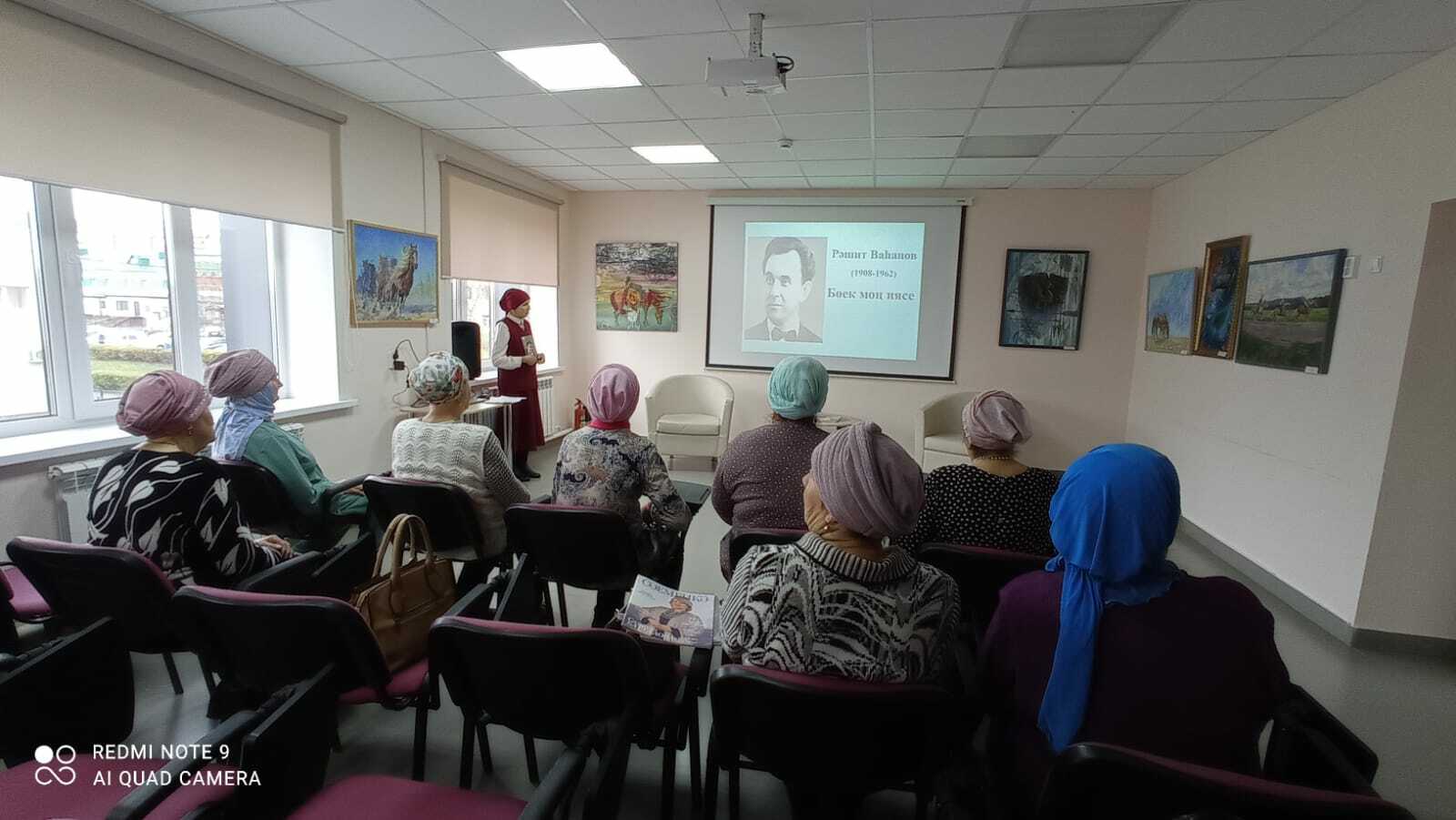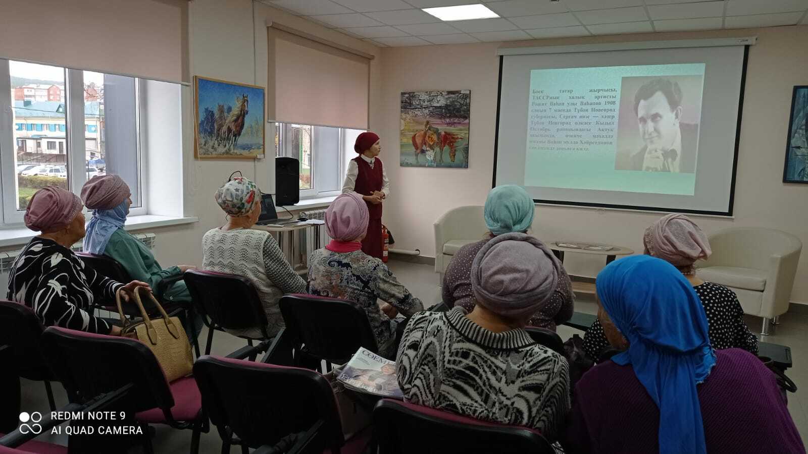 19 октября библиотекарь читального зала Салимова Т. Х., для членов клуба “Сююмбике”, провела тематический час, посвященный творчеству великого татарского певца, народного артиста ТАССР Рашита Вагапова. С помощью компьютерной презентации, библиотекарь познакомила с жизнью и творчеством певца. В ходе мероприятия отдыхающие прослушали интересные отрывки из книги руководителя фонда татарской культуры им. Р.Вагапова Рифата Фаттахова “Рашит Вагапов”, ознакомились с результатами конкурса молодых исполнителей Международного фестиваля татарской песни им.Р. Вагапова. Сотрудница Дома культуры Юнусова Альфинур окунула отдыхающих в мир музыки, исполнив песню “Умырзая”, из репертуара певца Рашита Вагапова.