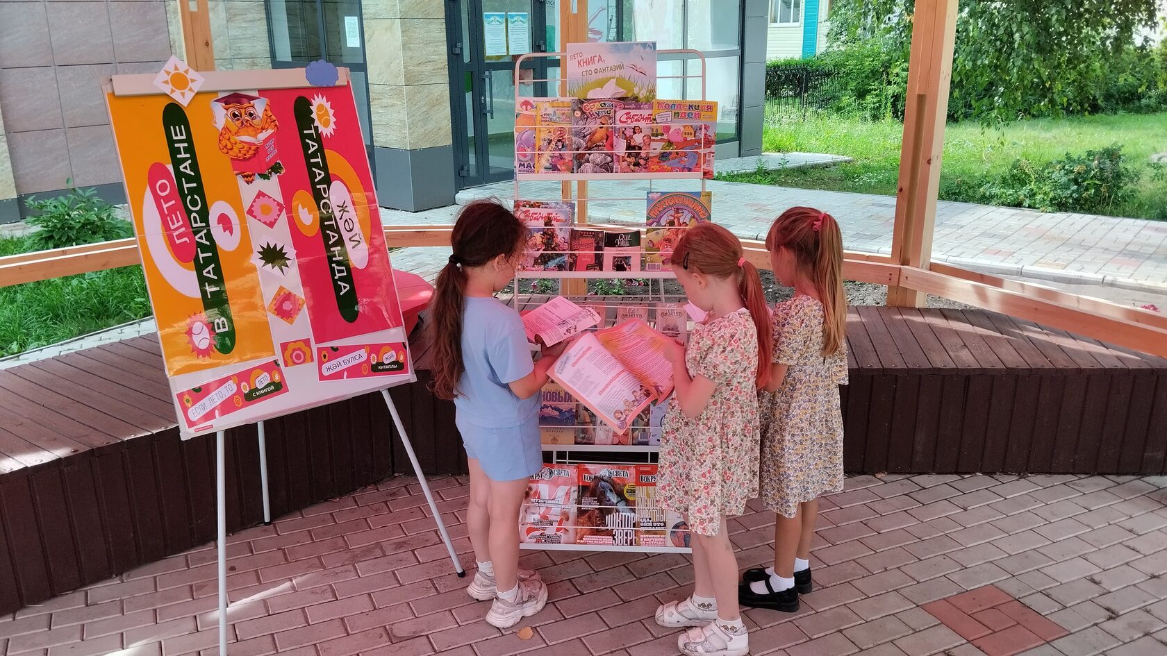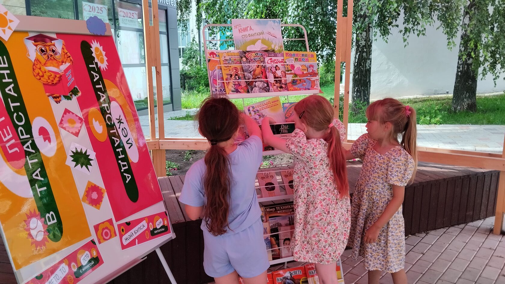 Посетители перед библиотекой знакомятся с журналами, книгами. Каждый читатель находит для себя что-то интересное. Романы с закрученным сюжетом, интересные повести, детские яркие красочные журналы, книжки ждут всех тех, кто любит читать.