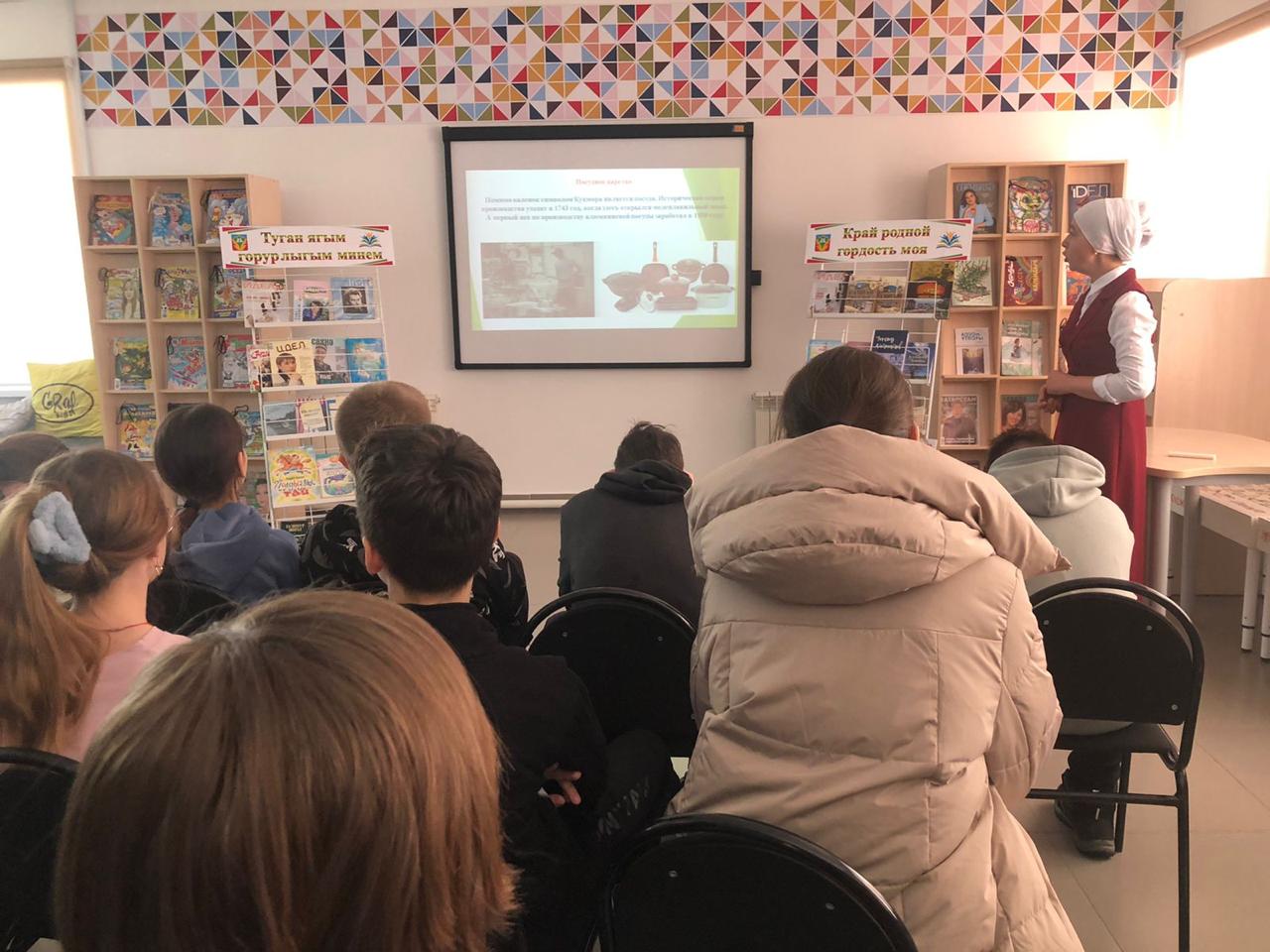 14 марта в центральной детской библиотеке имени С.В.Михалкова побывали в гостях учащиеся 6 классов г.Казани. Библиотекарь Гарифуллина Рамзия провела экскурсию по библиотеке и заочное путешествие «Край родной – гордость моя». Она рассказала ребятам об основных событиях истории края, познакомила с писателями-земляками, с достопримечательностями и промышленными предприятиями нашего города. Мероприятие завершилось обзором книг.