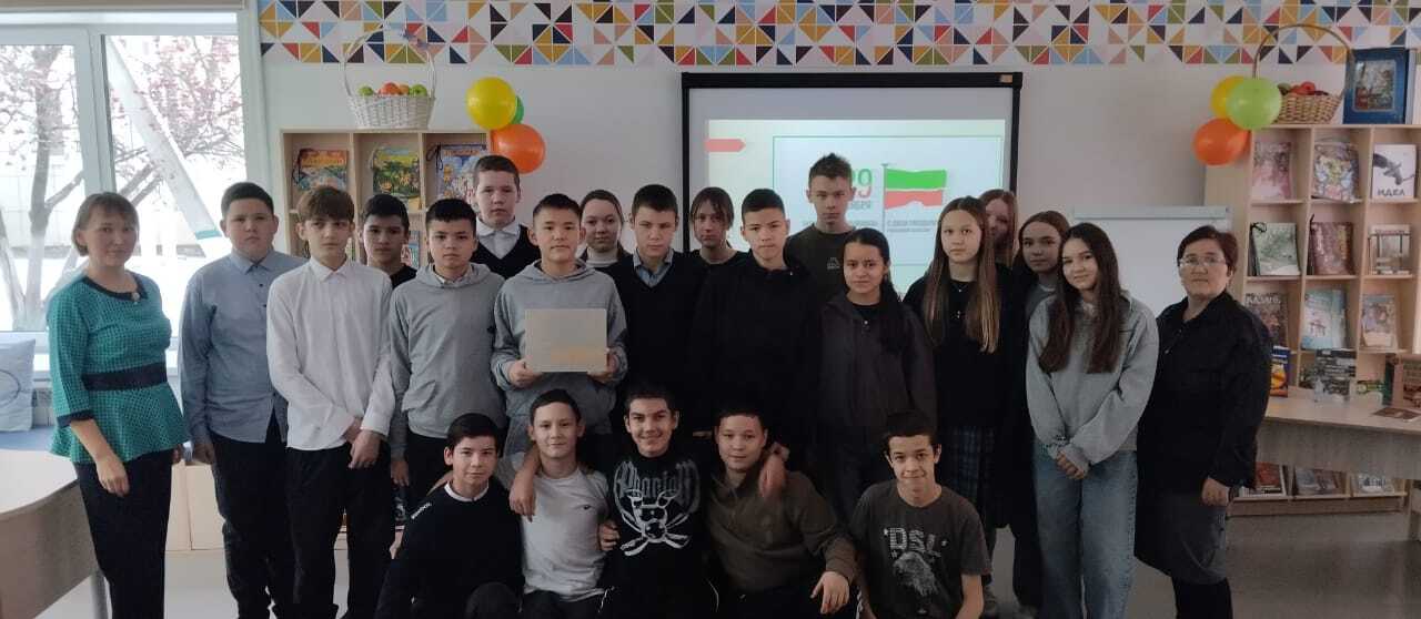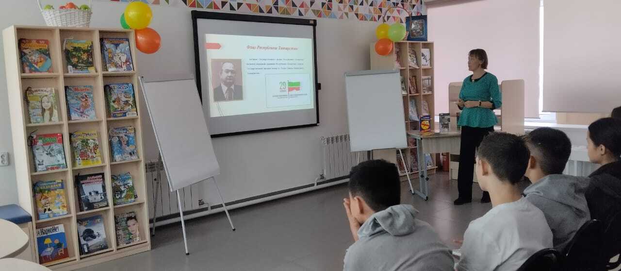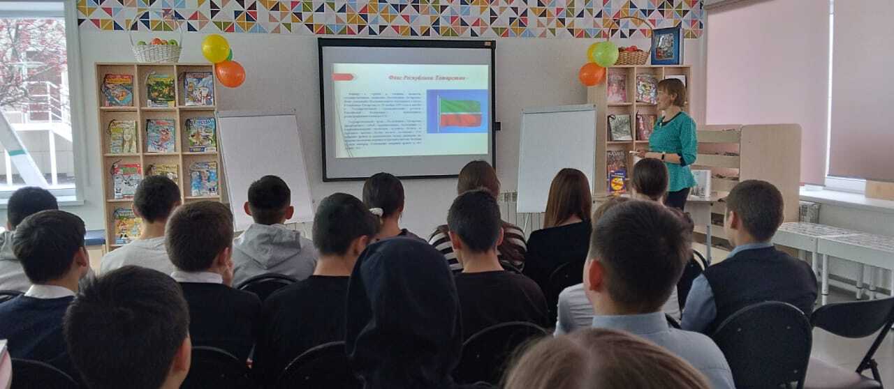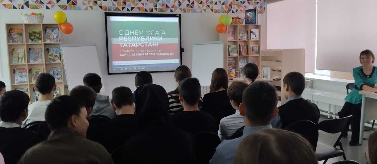 29 ноября библиотекарь центральной детской библиотеки имени С.В.Михалкова Асанова Алевтина для учащихся 8а класса Гимназии №1 им.Ч.Т.Айтматова провела познавательный час «Флаг Татарстана - наша гордость», приуроченный ко Дню Государственного флага Республики Татарстан. В ходе мероприятия она рассказала ребятам об истории создания флага, о его создателе, о том, что обозначают цвета триколора, в каких случаях поднимается флаг. Мероприятие завершилось обзором книг и просмотром видеоролика.
