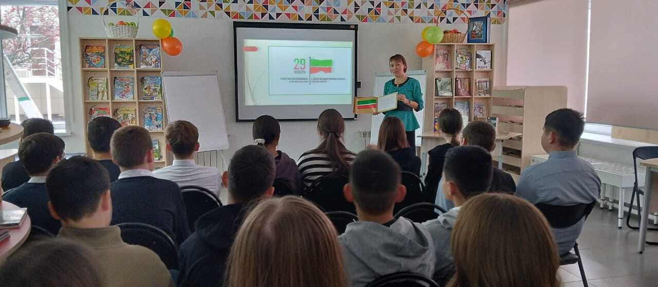 29 ноябрь көнне С.В.Михалков исемендәге үзәк балалар китапханәсе китапханәчесе Асанов Алевтина Ч.Т.Айтматов исемендәге 1 нче гимназиянең 8а сыйныф укучылары өчен Татарстан Республикасы Дәүләт флагы көненә багышланган “Татарстан флагы - безнең горурлыгыбыз” исемле танып белү сәгате үткәрде. Чара барышында ул балаларга флагның барлыкка килү тарихын, триколор төсләрен, нинди очракларда әләм күтәрелүе турында сөйләде. Чара китапларга күзәтү һәм видеоролик карау белән тәмамланды.