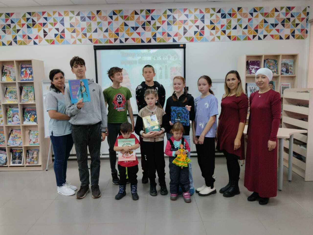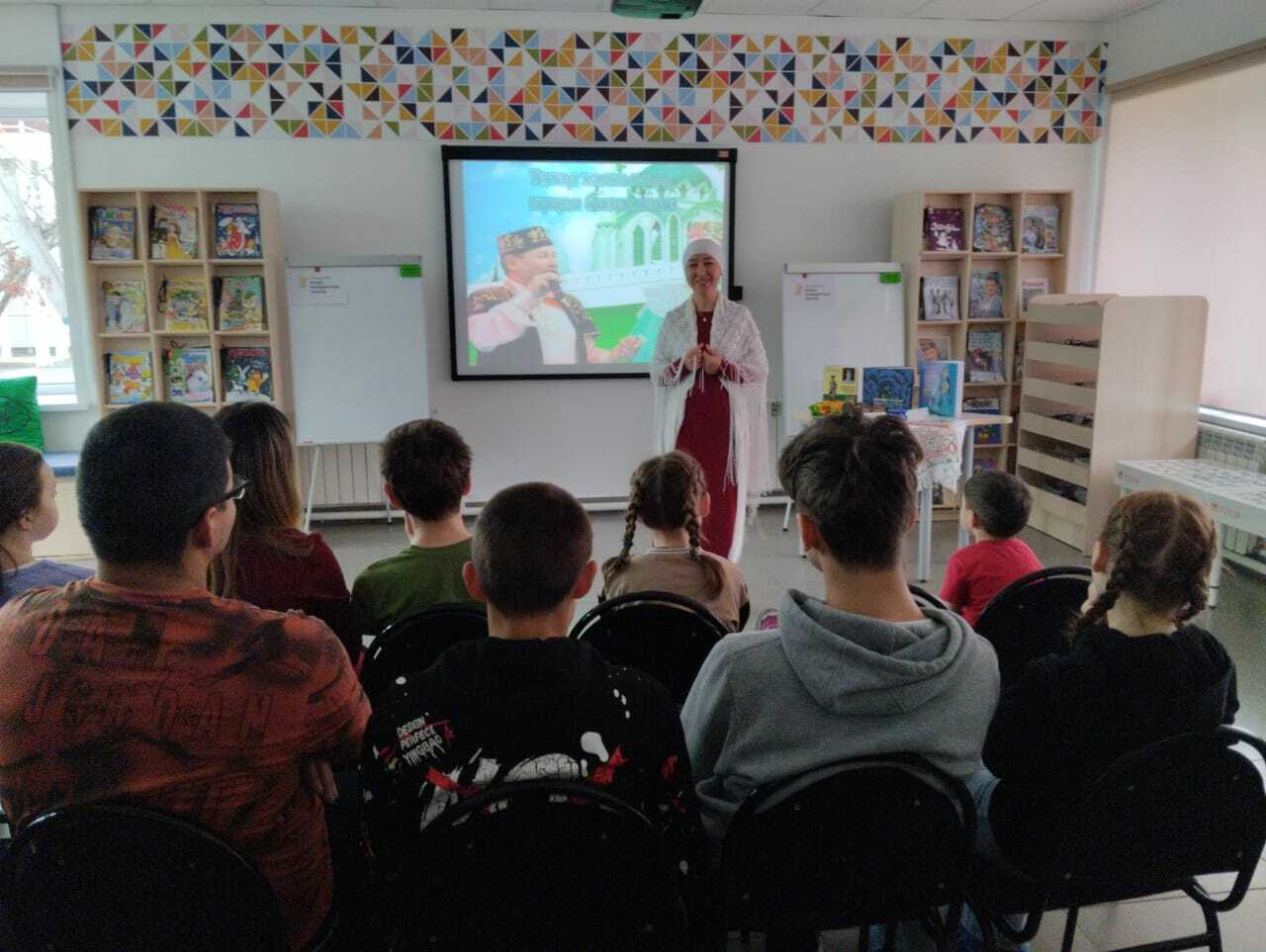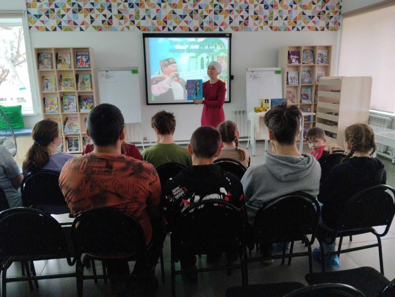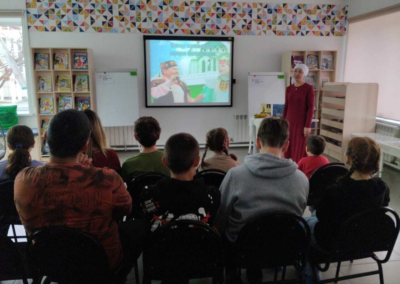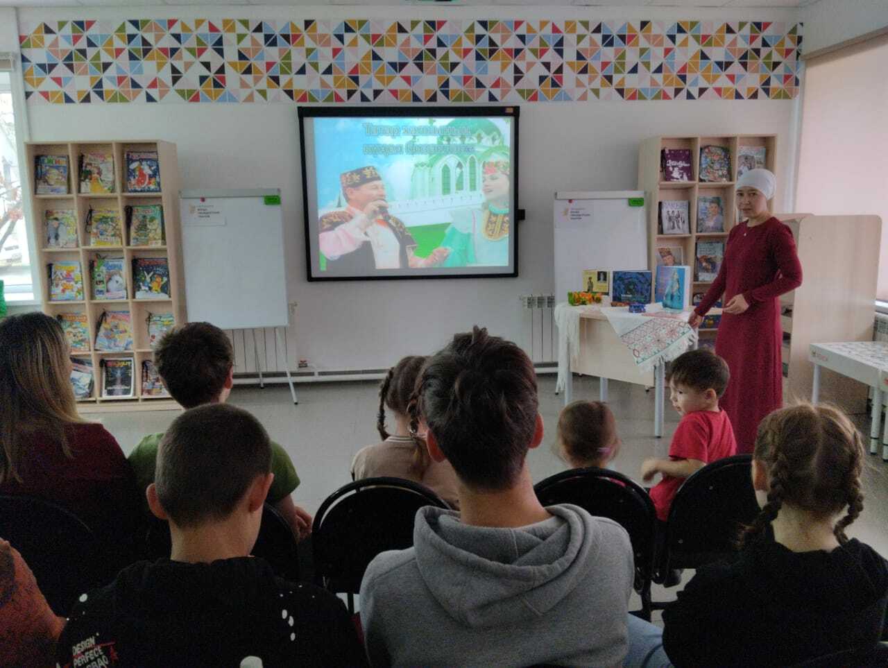 В рамках Года национальных культур и традиций библиотекарь центральной детской библиотеки имени С.В.Михалкова Гарифуллина Рамзия для детей, посещающих реабилитационный центр «Милосердие» провела час искусства «Татар халкының күңел бизәкләре». Она рассказала о татарских национальных узорах, показала вышитое полотенце, познакомила детей с татарским национальным костюмом, рассказала о деталях национальной одежды, из чего изготавливались украшения, о том, как одевались мужчины и женщины, о быте и укладе татарского народа, виды орнамента, характерные для татарского национального костюма. Мероприятие завершилось обзором книг и просмотром мультфильма «Камыр батыр».