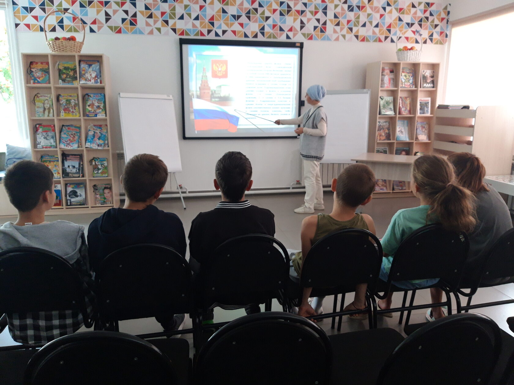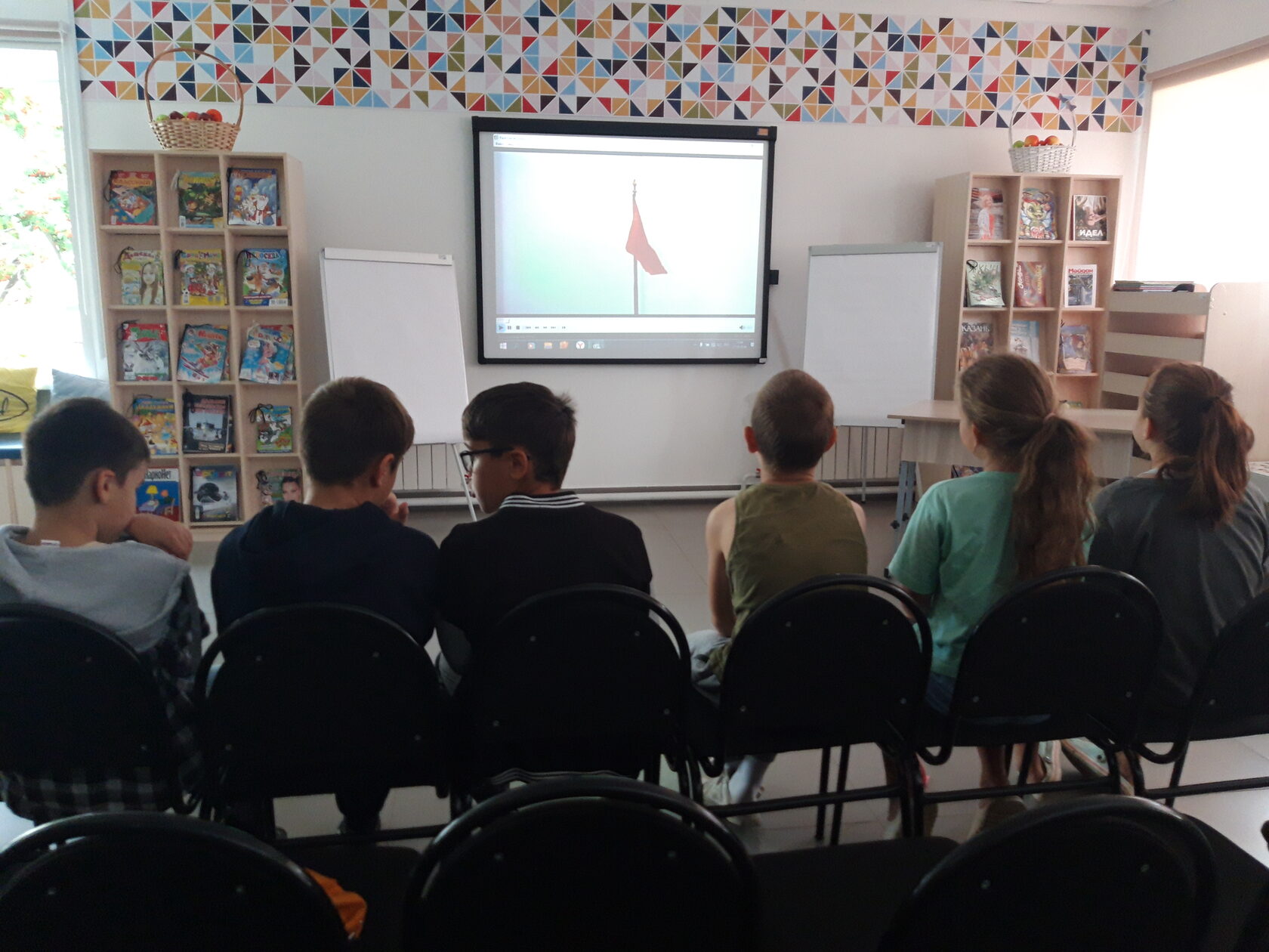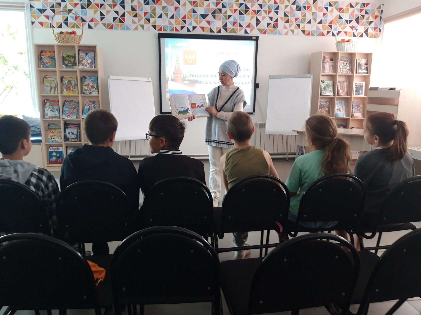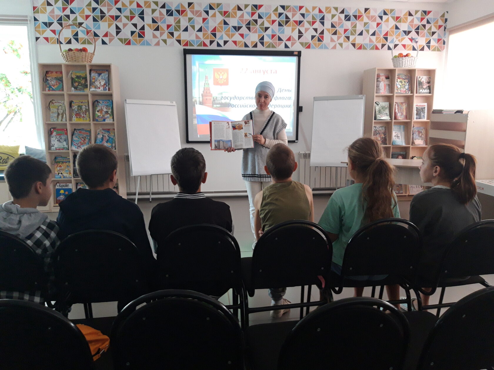 Библиотекарь центральной детской библиотеки имени С.В.Михалкова Гарифуллина Рамзия для читателей младшего школьного возраста познавательное путешествие по истории Государственного флага России «Белый, синий, красный цвет – символ славы и побед». Она рассказала ребятам об истории создания российского флага, о том, что обозначают три цвета и в каких случаях поднимается флаг. На мероприятии прозвучали стихи о флаге и России, пословицы о Родине. Мероприятие завершилось обзором книг и просмотром видеофильма об истории флага.
