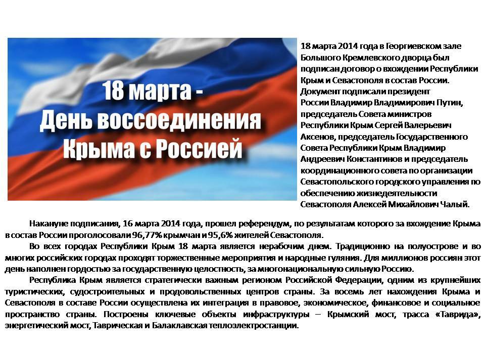 18 марта в Российской Федерации отмечается День воссоединения Крыма с Россией.