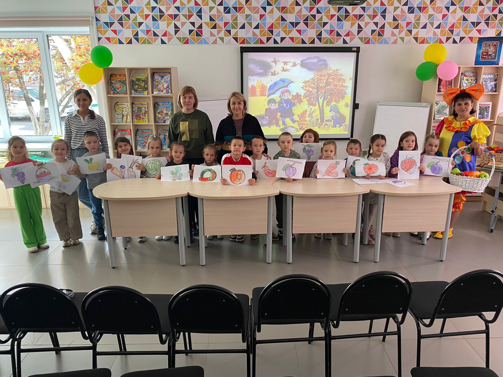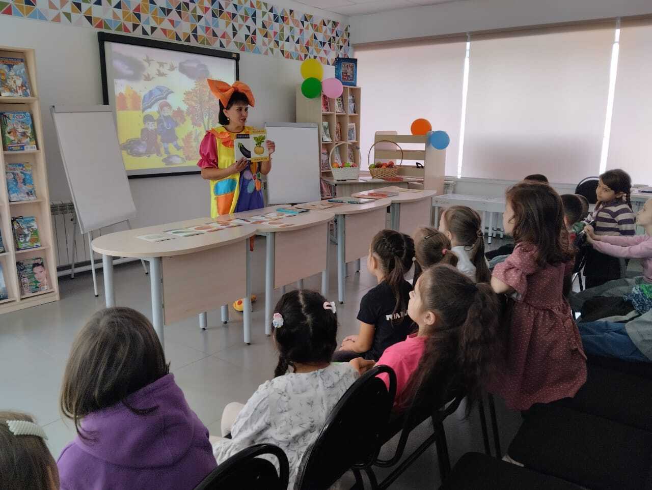 3 октября библиотекарь центральной детской библиотеки им.С.В.Михалкова Закирова Фирдания для детей подготовительной группы детского сада «Ромашка» провела экскурсию по библиотеке и конкурсно-игровую программу «Яркие краски осени». Она рассказала ребятам об осенних месяцах, признаках осени, познакомила с книгами об этой удивительной поре, которая дарит нам разноцветные краски, вкусные сюрпризы. Ребята с интересом участвовали в различных конкурсах и играх, отгадывали осенние загадки, раскрасили на рисунках свои любимые фрукты и овощи, посмотрели мультфильм про осень.