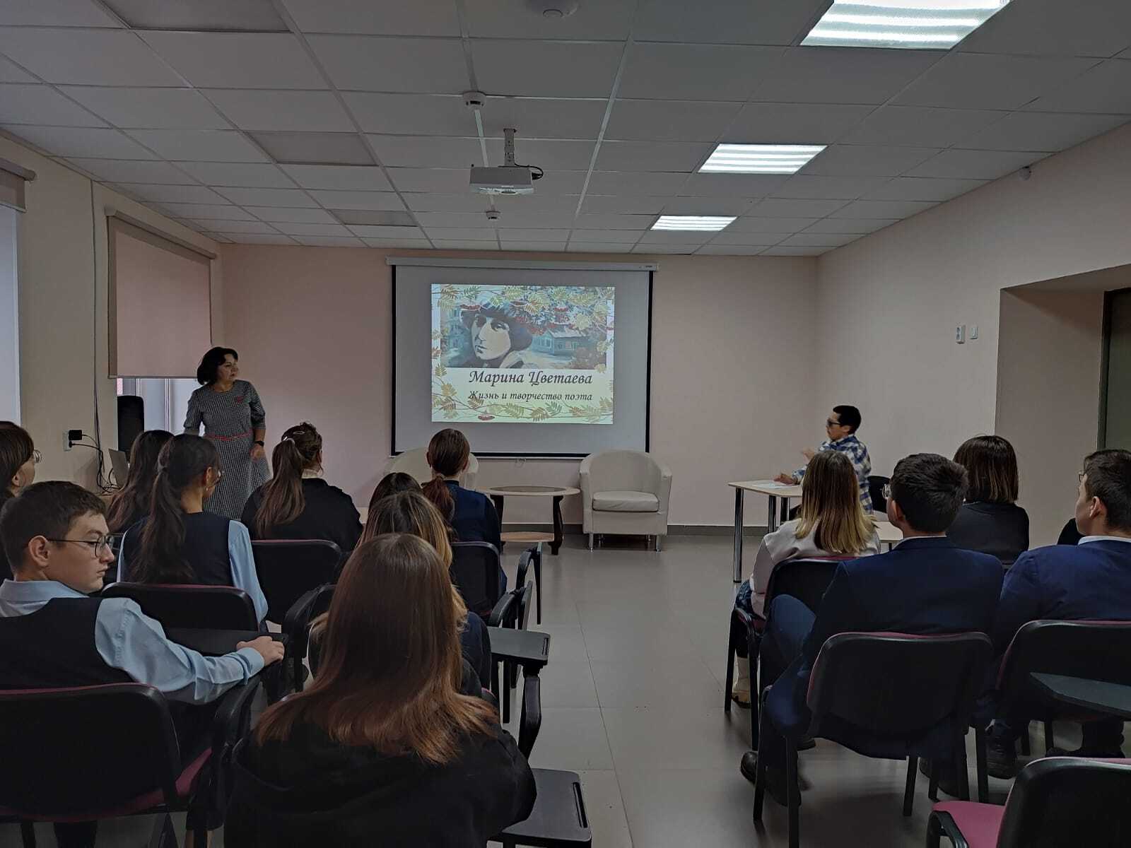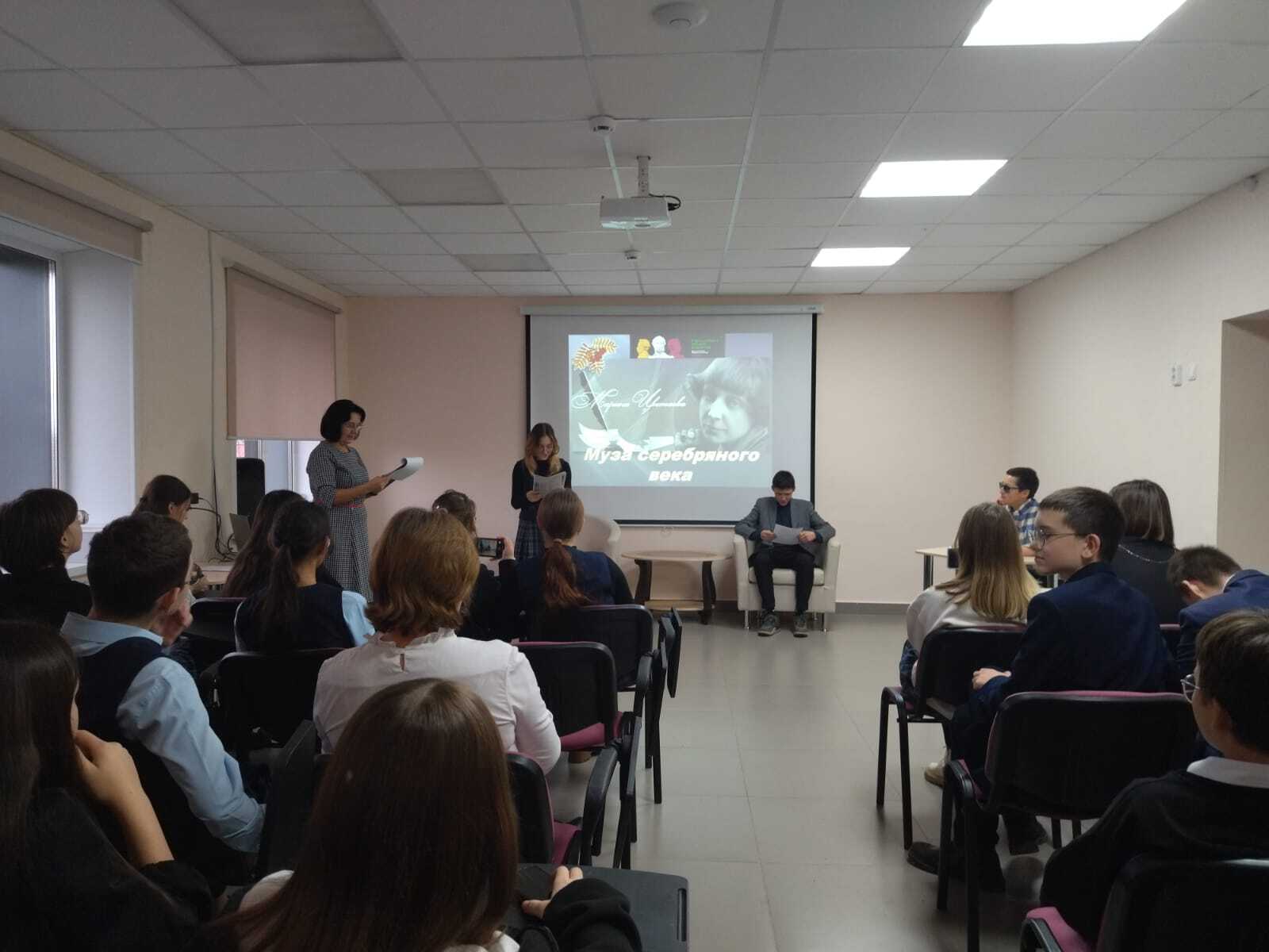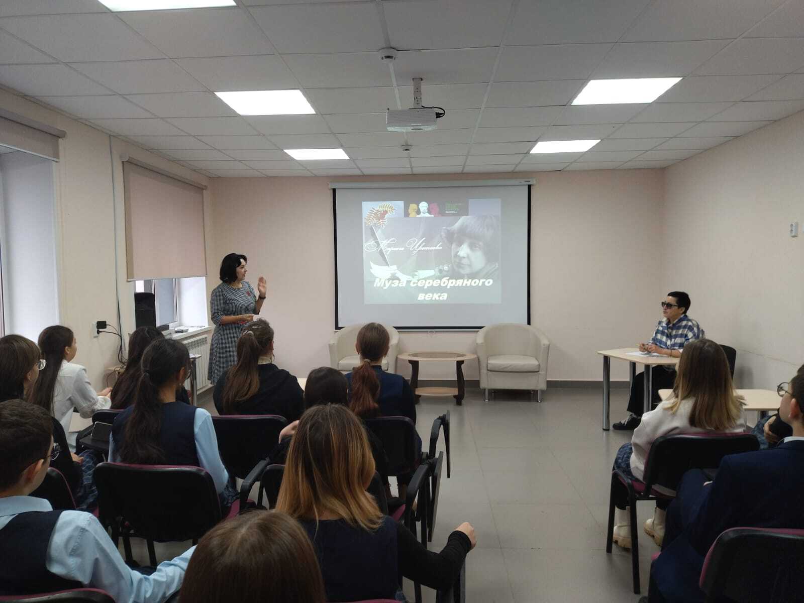 15 ноября, в рамках проекта «Пушкинская карта», библиотекарь Пахомова В.Г., для учащихся 8 класса гимназии №1 им. Ч.Т.Айтматова, провела литературный вечер: «Муза Серебряного века». Присутствующие познакомились с жизнью и творчеством поэтессы, со сборниками ее стихов, воспоминаниями о ней родных и друзей. В завершение мероприятия ребята приняли участие в литературной игре «Турнир эрудитов».
