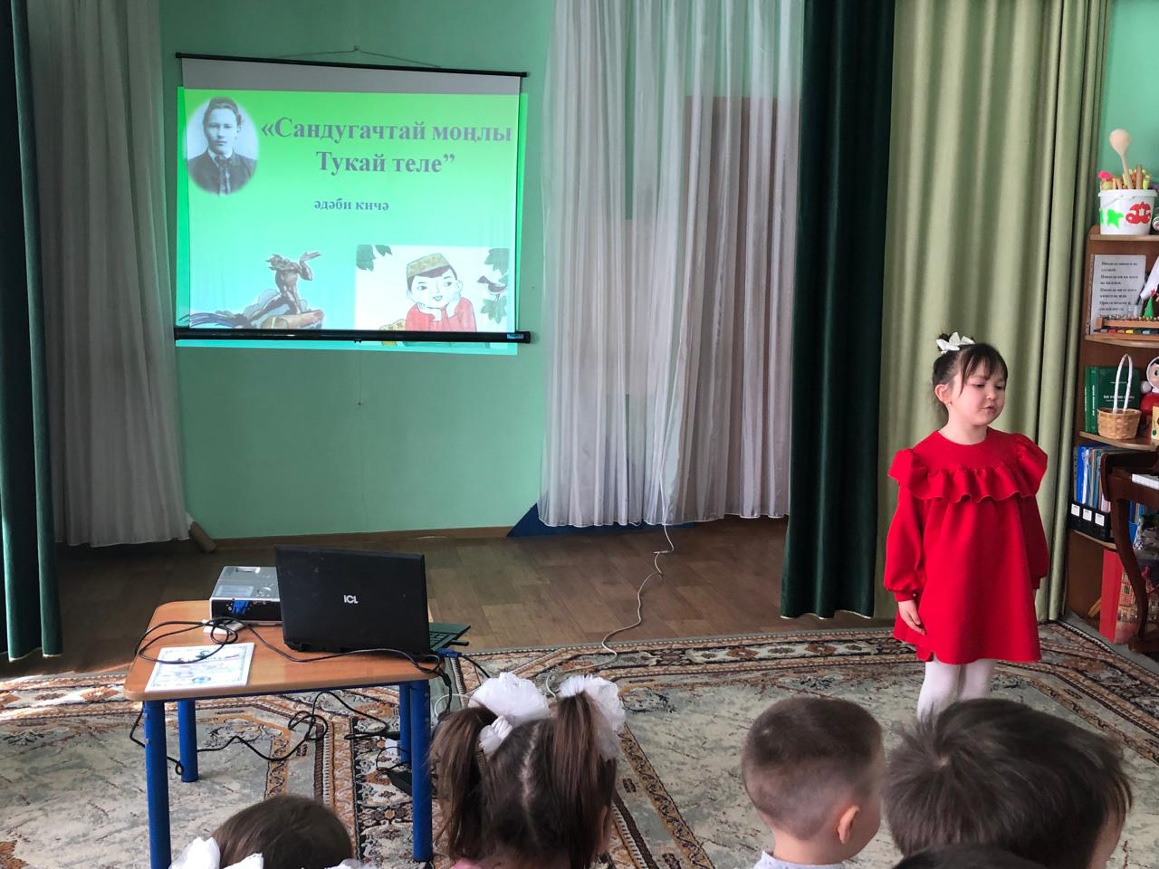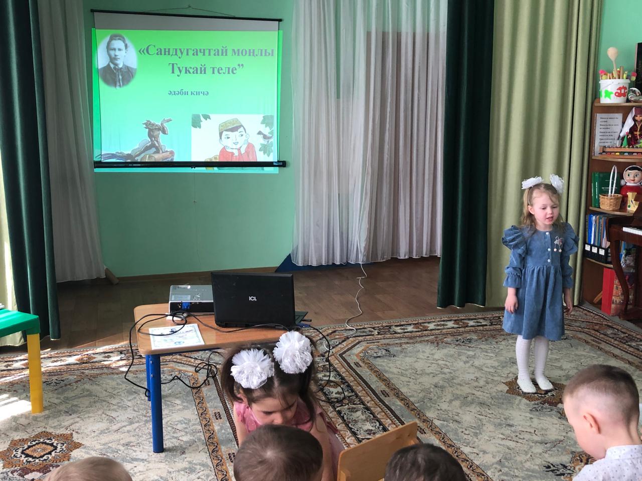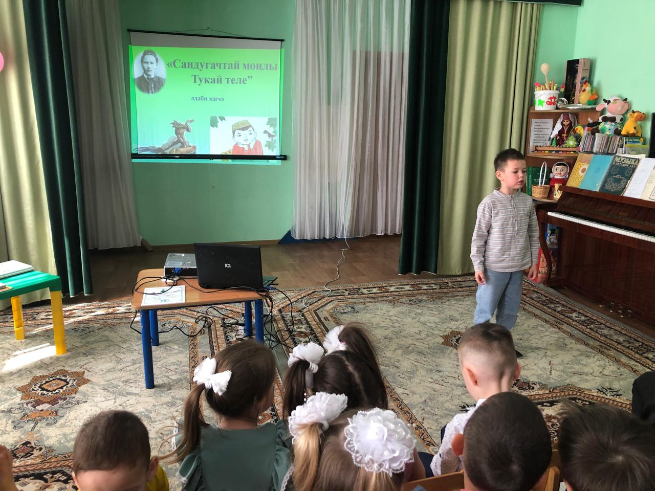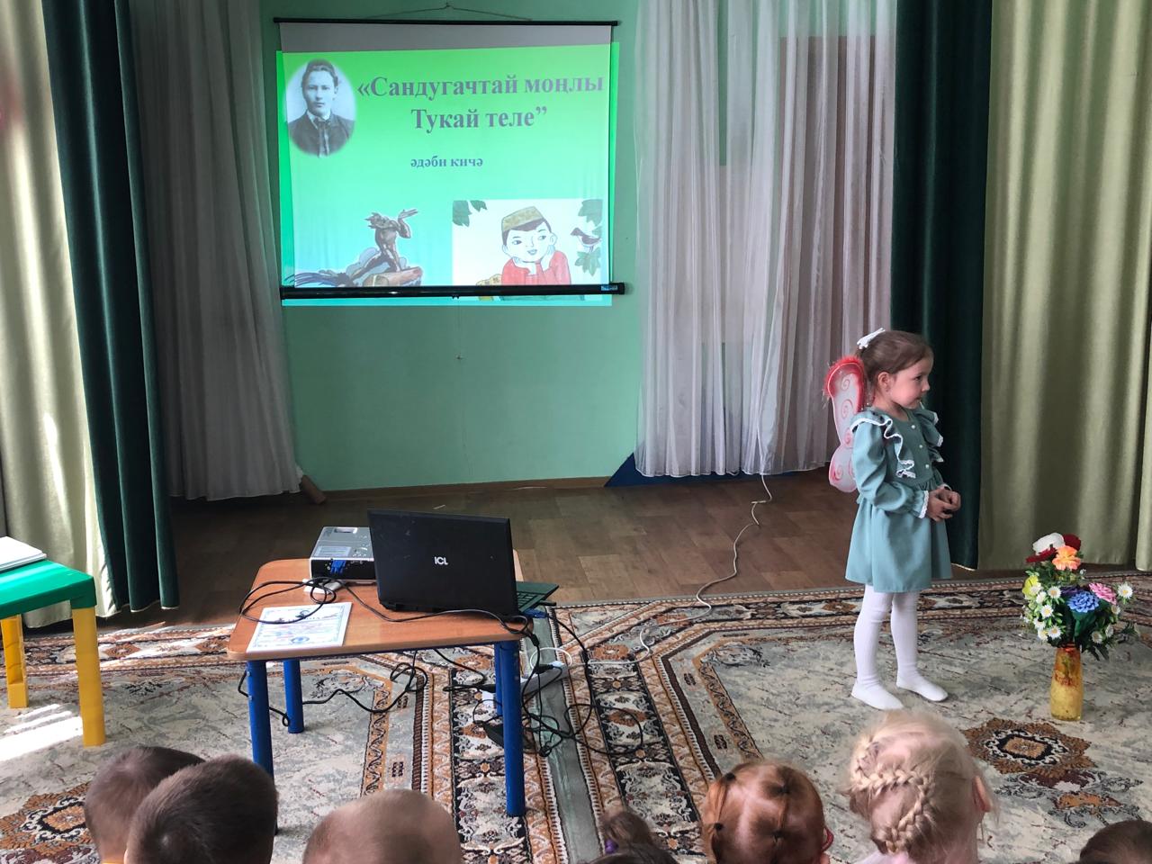 17 апреля центральная детская библиотека имени С.В.Михалкова совместно с детским садом «Шатлык» с.Большой Кукмор провели конкурс стихов «Сандугачтай моңлы Тукай теле», посвящённый 139 летию со дня рождения татарского поэта Габдуллы Тукая. В конкурсе приняли участие дети разновозрастных групп. Библиотекарь Закирова Фирдания рассказала о тяжелом детстве, о творческом пути поэта, познакомила с его книгами. Затем дети выразительно рассказали стихотворения, воспевая любовь к родному языку, родному краю, его природе. Всем участникам конкурса были вручены грамоты. Мероприятие завершилось исполнением песни “Туган тел”.