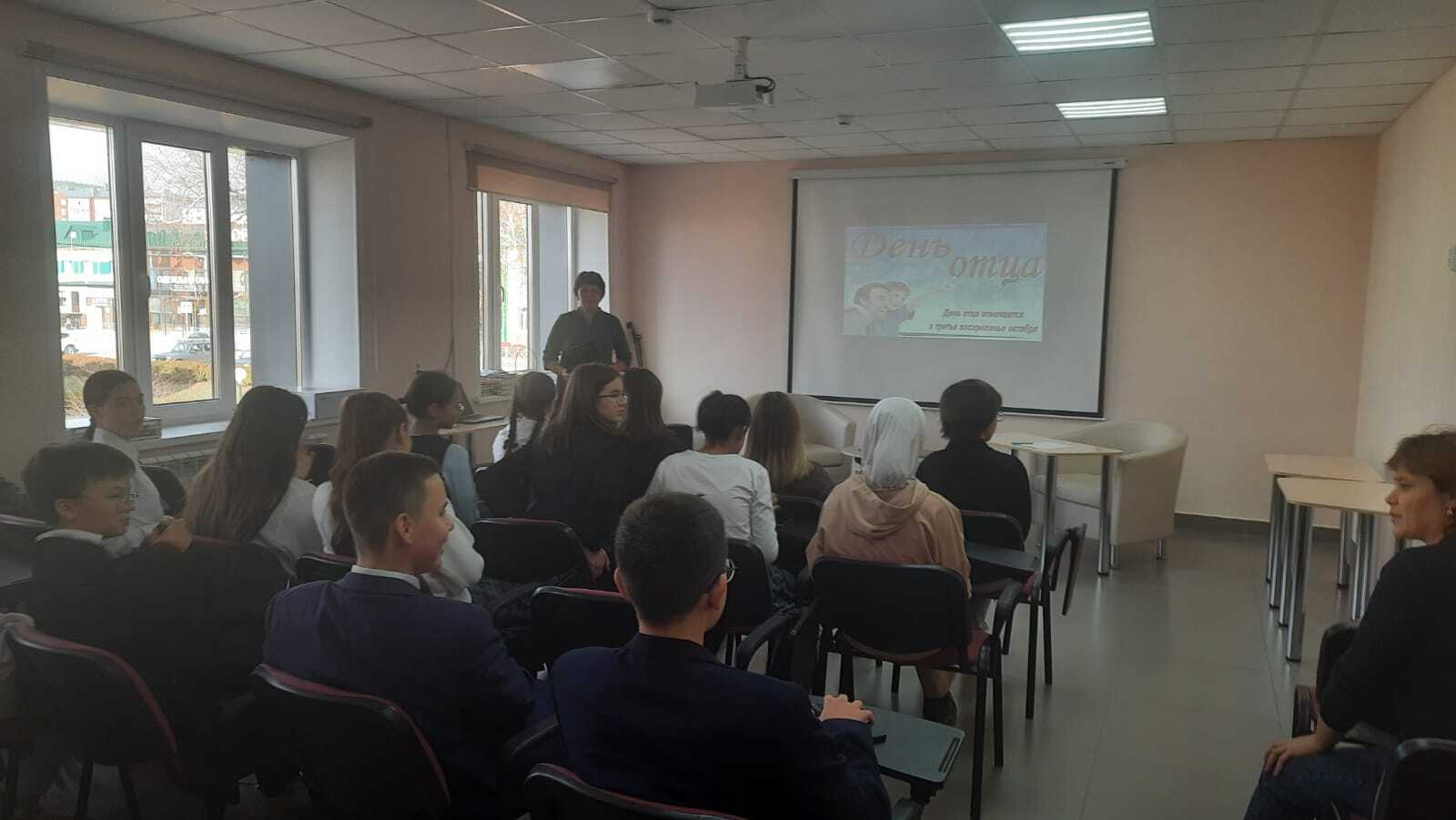 19 октября в преддверии дня отца, библиотекарь отдела обслуживания Саттарова Л.Р., для учащихся 8 класса гимназии №1 имени Ч,Т.Айтматова, провела тематический час: «Отец-как много в этом слове!». В ходе мероприятия, ребята узнали об истории молодого праздника, когда и откуда пошла традиция празднования Дня отца, как и в каких странах его сегодня отмечают. Мероприятие сопровождалось компьютерной презентацией.