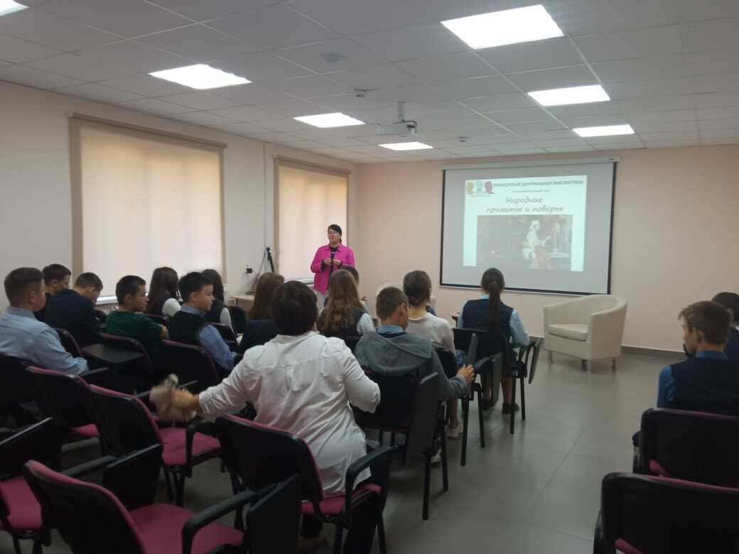 17 сентябрьдә, «Пушкин картасы» проекты кысаларында, хезмәт күрсәтү бүлеге китапханәчесе Гарипова Л.Д., Ч.Т. Айтматов исемендәге №1 гимназияның 8 нчы сыйныф укучылары өчен, «Халык ырымнары һәм ышанулары» исемле танып белү сәгате үткәрде.