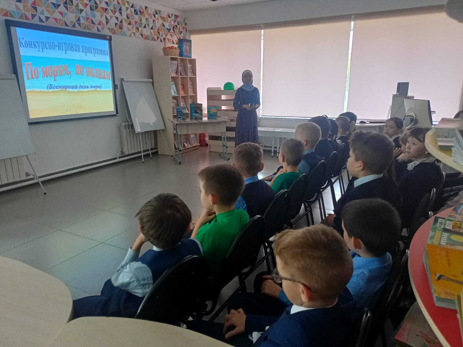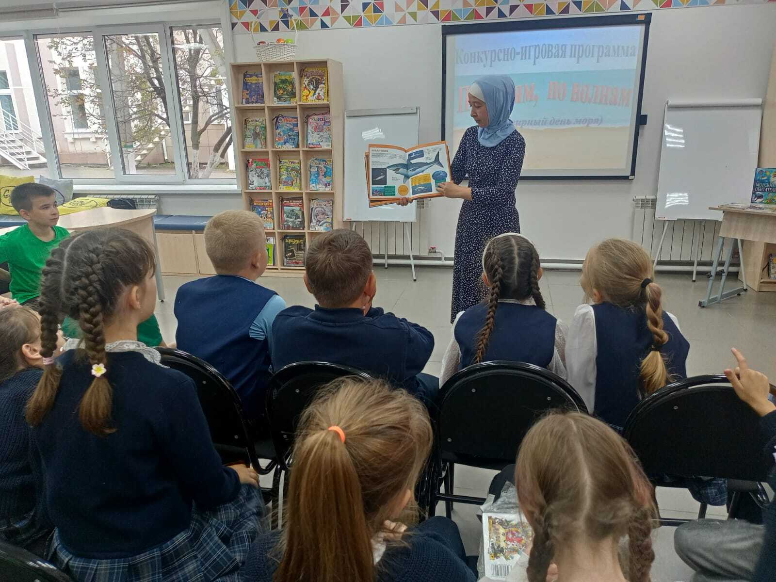 24 сентября библиотекарь детской библиотеки имени С.В.Михалкова Гарифуллина Рамзия для учащихся 3б класса Многопрофильного лицея имени А.М.Булатова провела познавательный час «По морям, по волнам», посвященный Всемирному дню моря. Ребята узнали много интересного о морях и океанах, их обитателях и тайнах, разгадали морские загадки, ответили на вопросы викторины, участвовали в конкурсах и играх. Мероприятие завершилось обзором книг и просмотром видеофильма «Десять самых опасных морских обитателей».