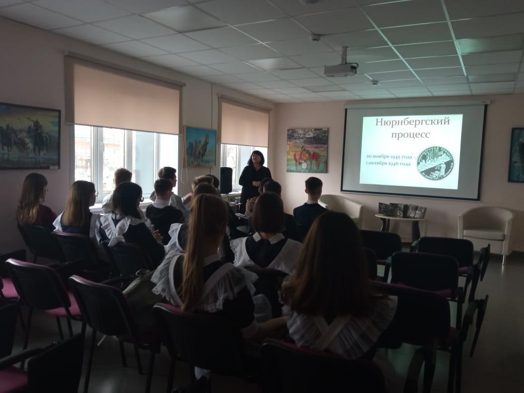 20 ноябрьдә Үзәк китапханәдә үткән «Нюрнберг процессы: агрессия өчен түләү» тарих сәгате Нюрнберг процессының 77 еллыгына багышланды. Чарада Ч.Т.Айтматов исемендәге 1 нче гимназиянең 10 сыйныф укучылары катнашты.