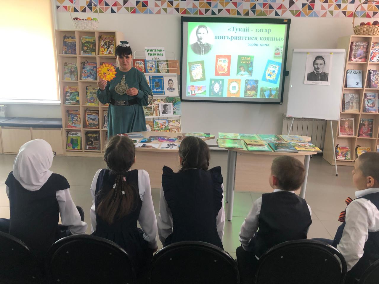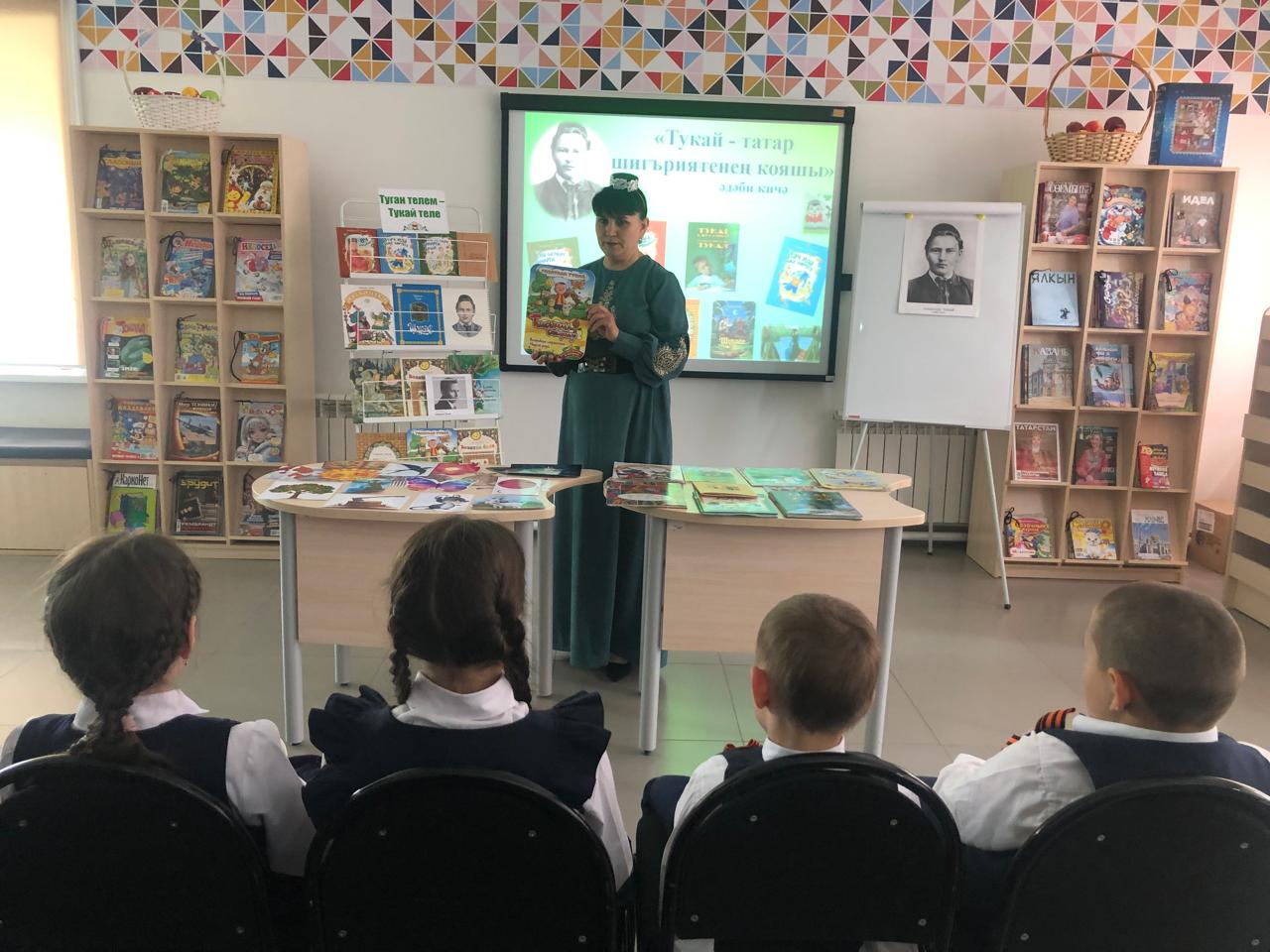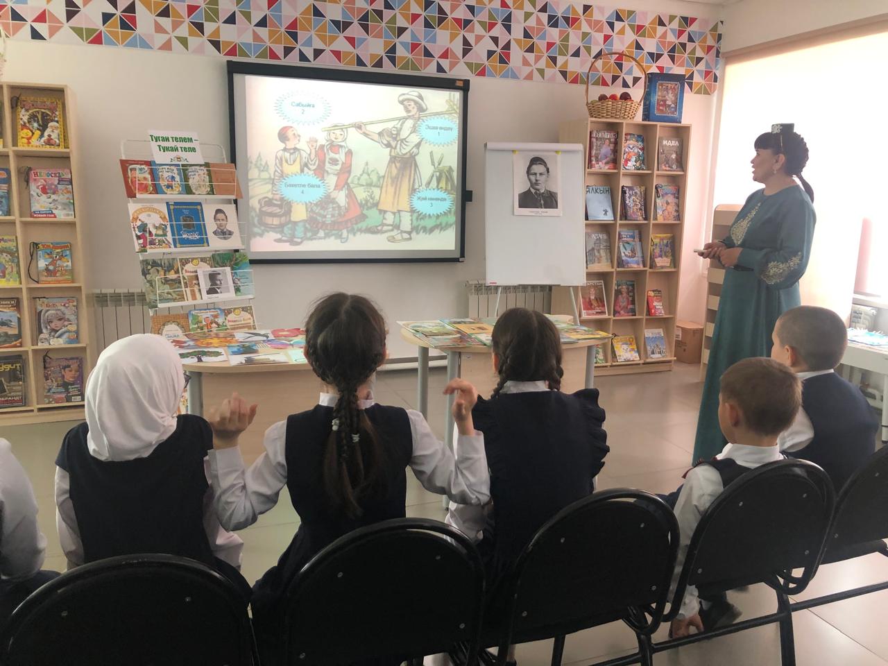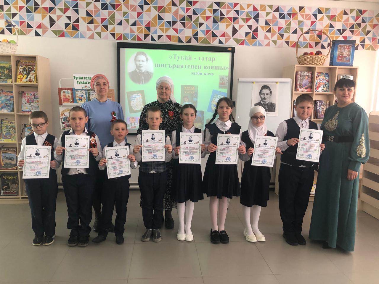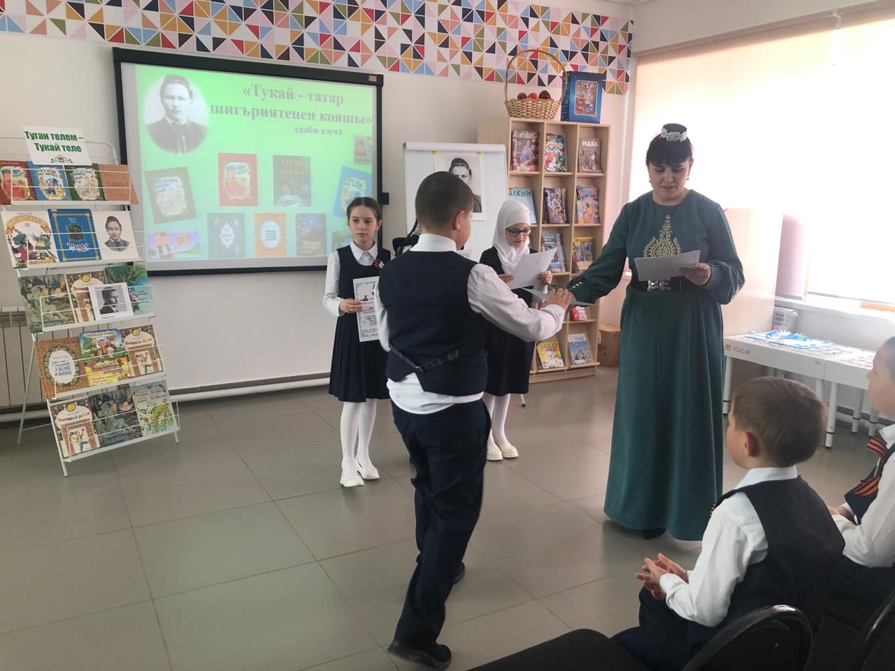 25 апреля библиотекарь центральной детской библиотеки имени С.В.Михалкова Закирова Фирдания для учащихся начальных классов филиала МБОУ “ООШ им.Х.В.Вагапова с.Березняк” в деревне Камышлы провела экскурсию по библиотеке и литературный час “Тукай – татар шигъриятенең кояшы”, посвящённый 139-летию со дня рождения татарского поэта Габдуллы Тукая. Она рассказала о тяжелом детстве, о творческом пути поэта, познакомила с его книгами. Дети ответили на вопросы викторины по творчеству поэта, выразительно читали стихотворения, воспевающие любовь к родному языку, родному краю, его природе, исполнили песни на слова Г.Тукая. Все участникам мероприятия были вручены грамоты. Мероприятие завершилось исполнением песни “Туган тел”.