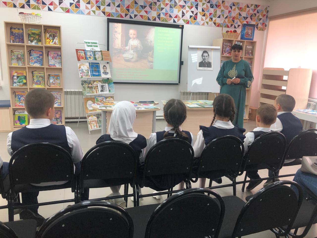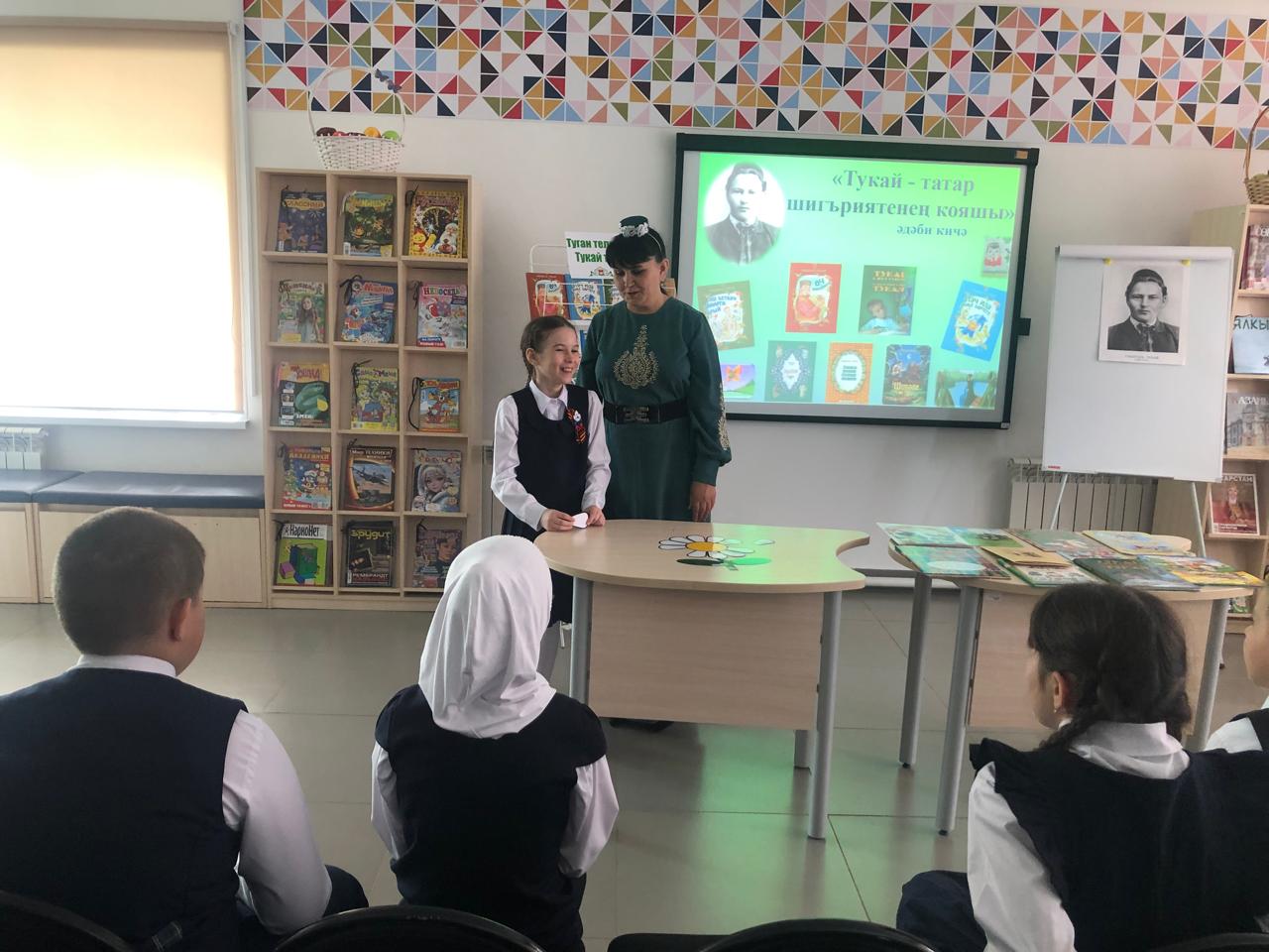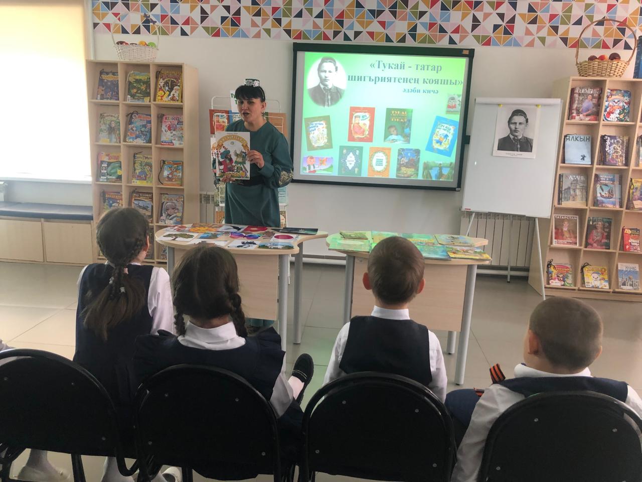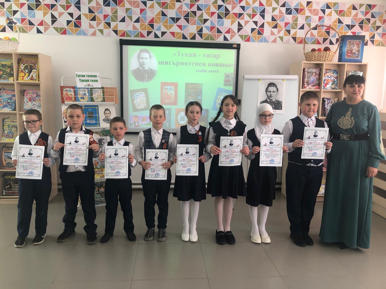25 апреля библиотекарь центральной детской библиотеки имени С.В.Михалкова Закирова Фирдания для учащихся начальных классов филиала МБОУ “ООШ им.Х.В.Вагапова с.Березняк” в деревне Камышлы провела экскурсию по библиотеке и литературный час “Тукай – татар шигъриятенең кояшы”, посвящённый 139-летию со дня рождения татарского поэта Габдуллы Тукая. Она рассказала о тяжелом детстве, о творческом пути поэта, познакомила с его книгами. Дети ответили на вопросы викторины по творчеству поэта, выразительно читали стихотворения, воспевающие любовь к родному языку, родному краю, его природе, исполнили песни на слова Г.Тукая. Все участникам мероприятия были вручены грамоты. Мероприятие завершилось исполнением песни “Туган тел”.