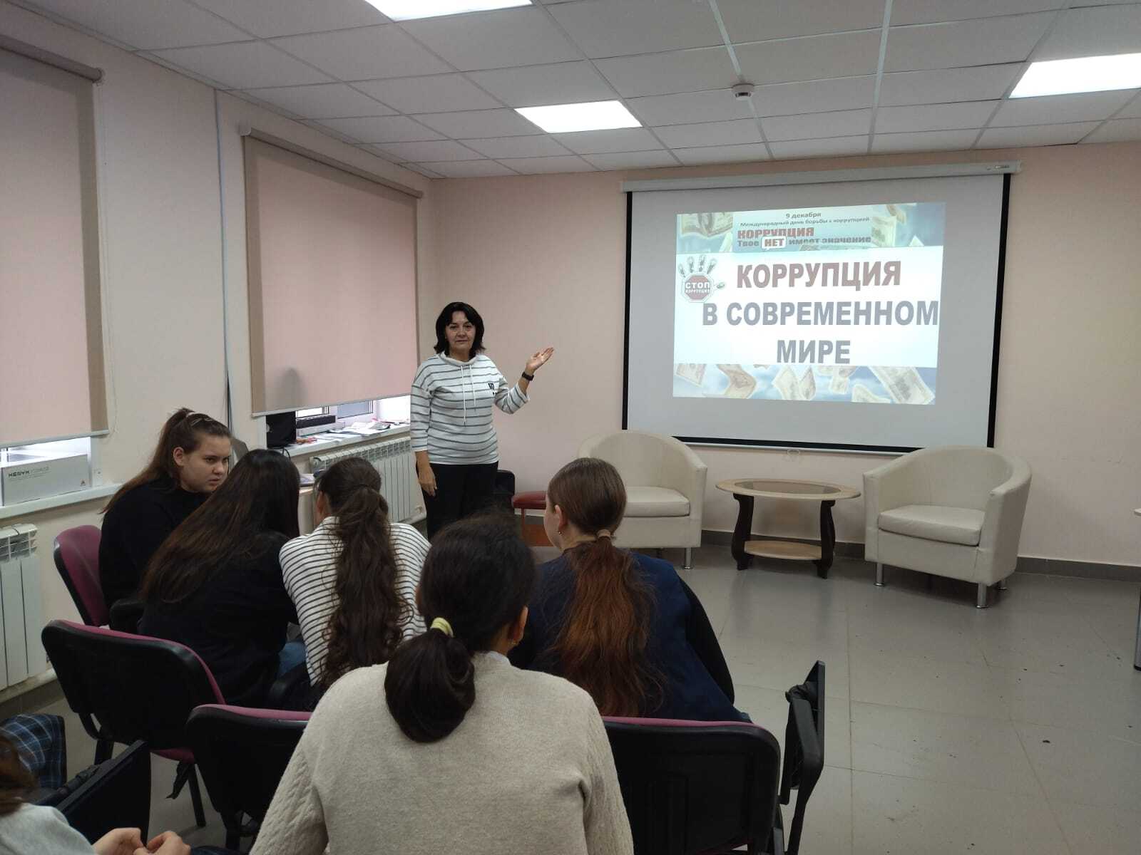 9 декабрь көнне, Ч.Т. Айтматов исемендәге №1 гимназияның 8 «б» сыйныф укучылары өчен, хезмәт күрсәтү бүлеге китапханәчесе В.Г. Пахомова «Вөҗдан һәм намус белән яшәргә» дигән профилактик әңгәмә үткәрде. Әңгәмә барышында балалар бу календарь датаның тарихы, барлык илләргә һәм төбәкләргә кагыла торган катлаулы күренеш турында белделәр, коррупциянең сәбәпләре һәм формалары белән таныштылар, «Коррупция» исемле видеоролик карадылар.