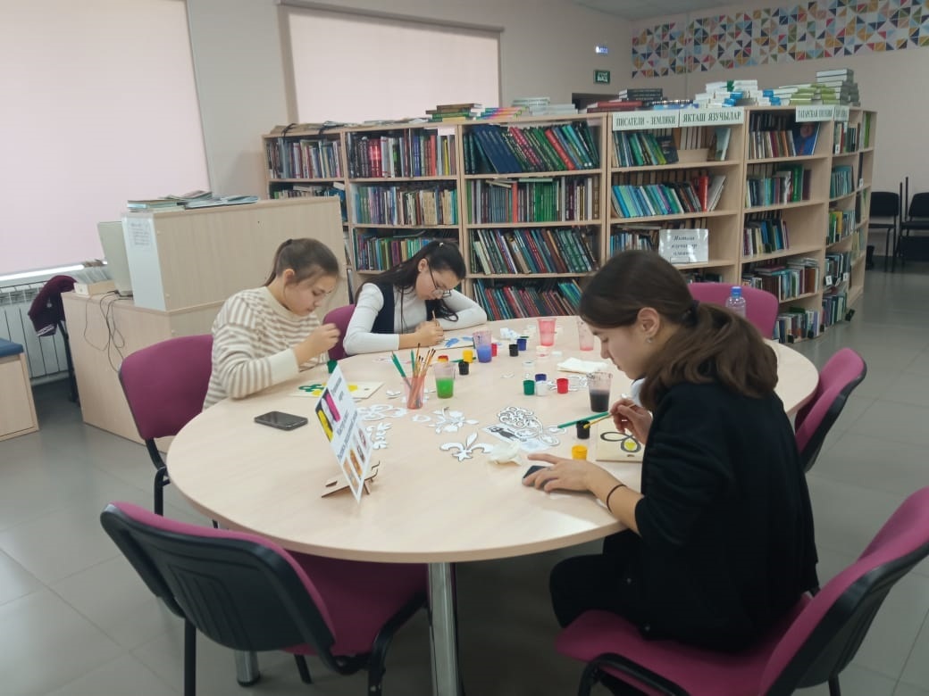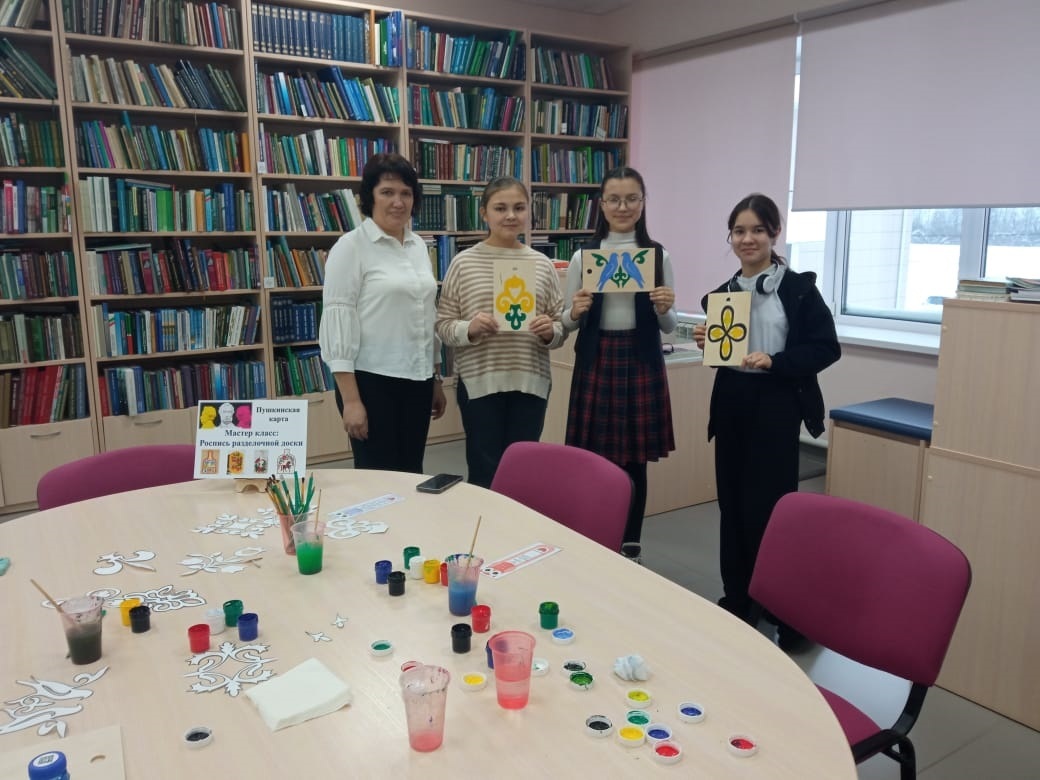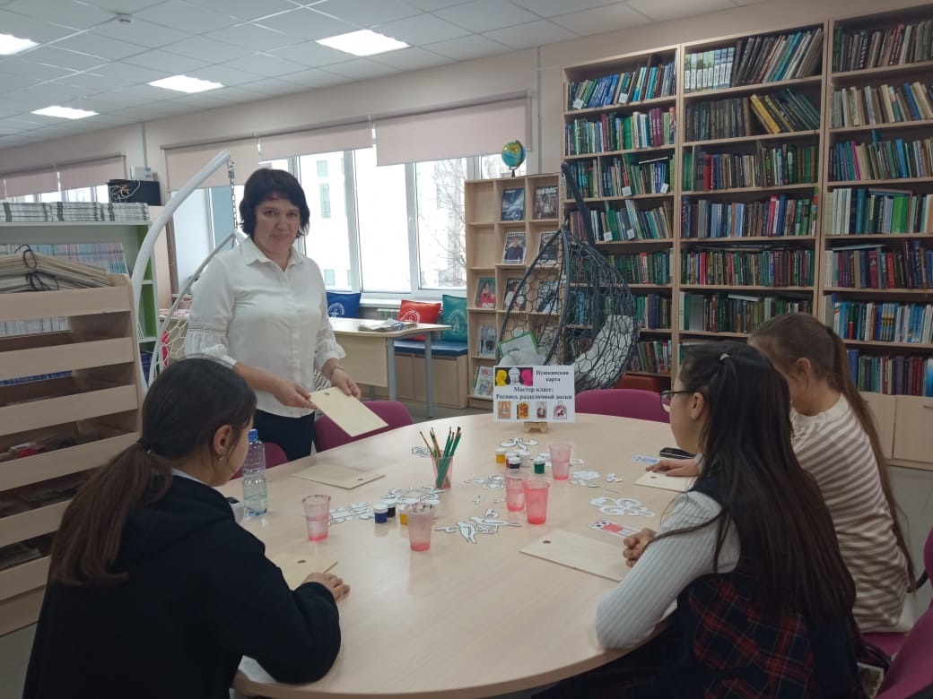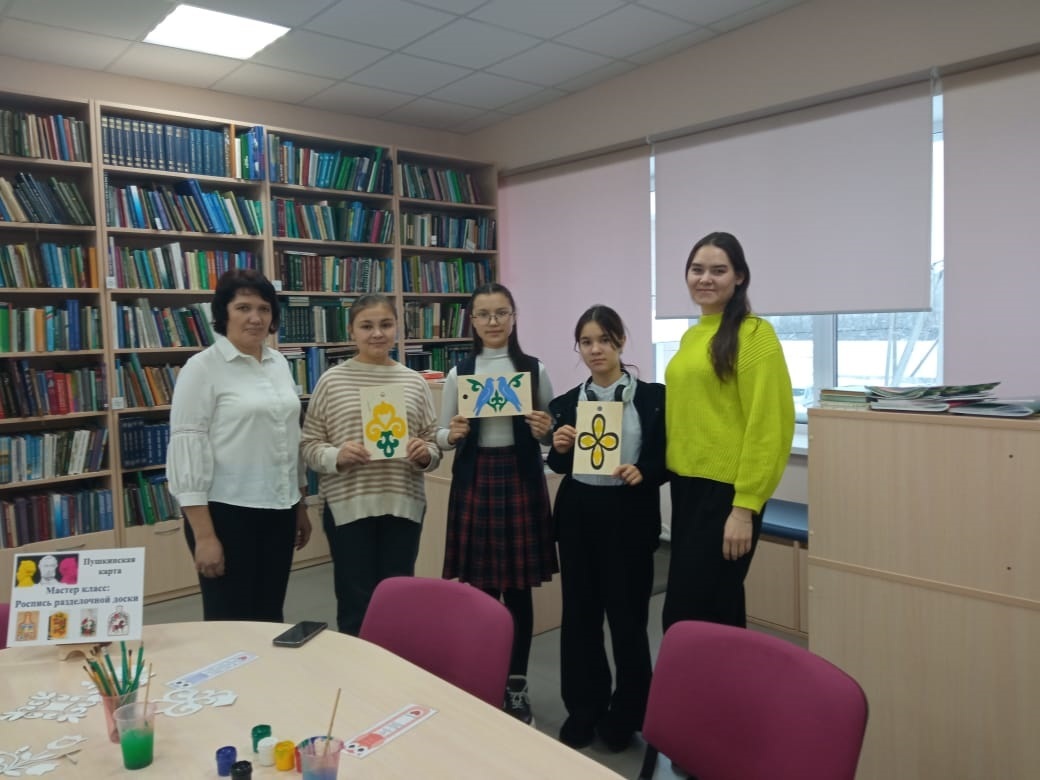 8 февраль көнне, "Пушкин картасы" проекты кысаларында, Үзәк китапханәдә, укучылар өчен татар орнаменты белән куна тактасын буяу буенча мастер-класс үтте.