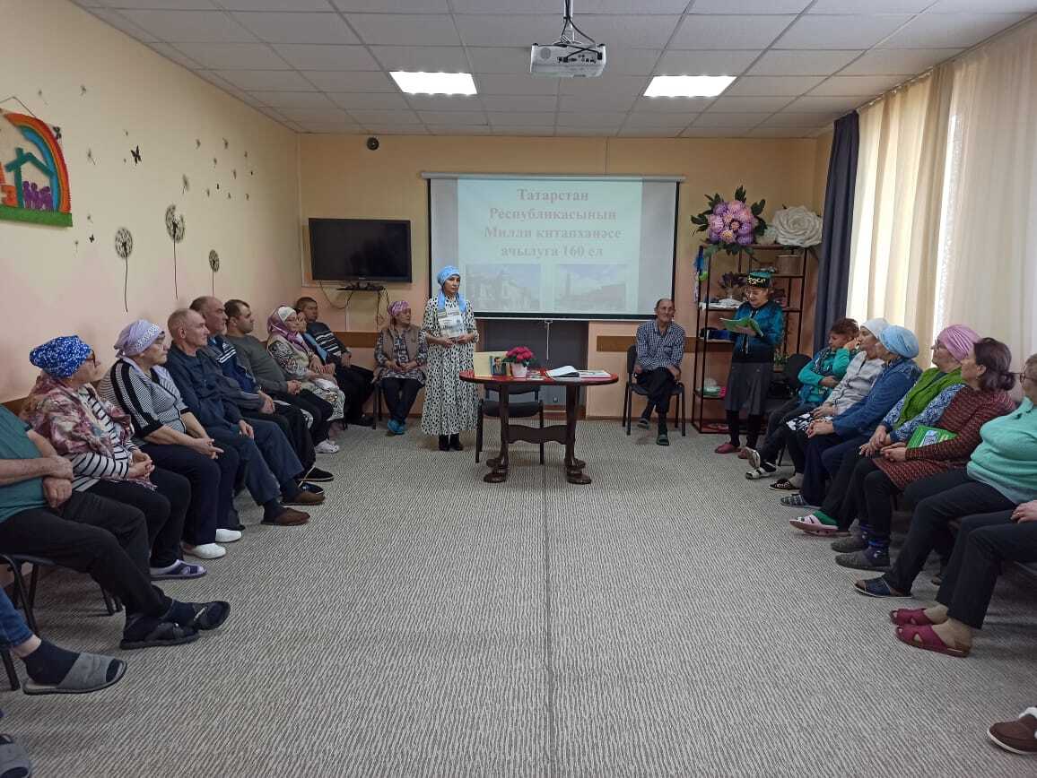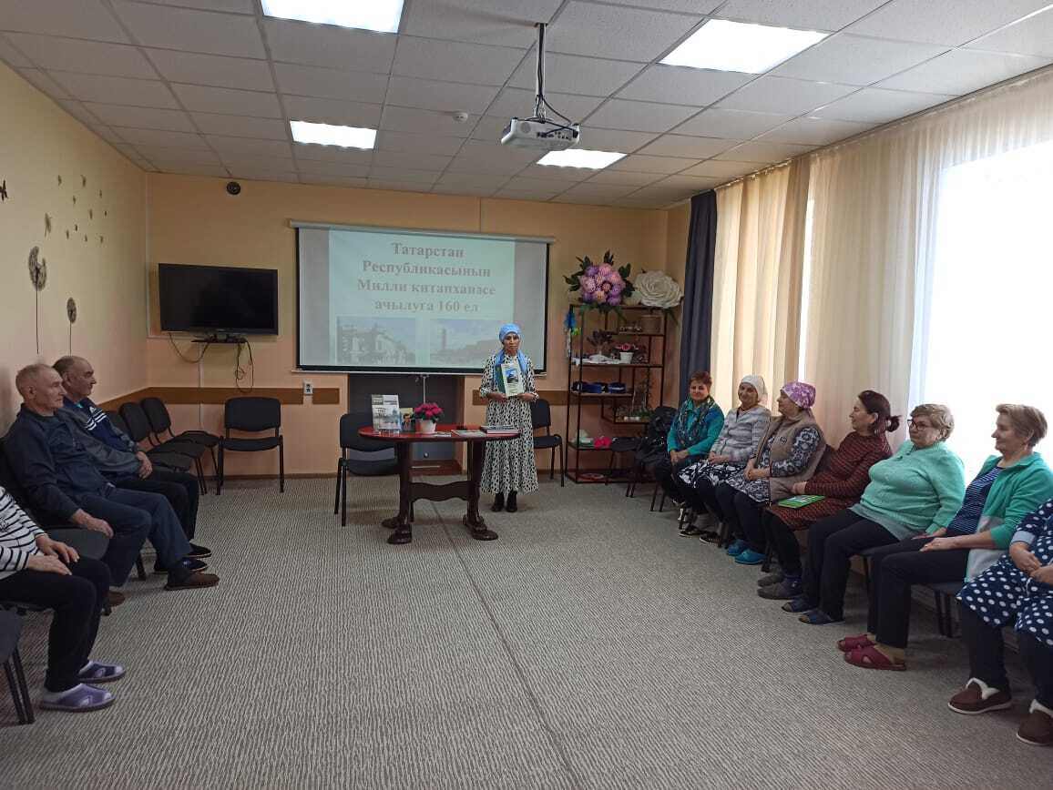 22 гыйнвар көнне уку залы китапханәчесе Сәлимова Т.Х., социаль ярдәм үзәге “НАЗ” да ял итүче пенсионерлар өчен, Милли китапханәнең 160 еллык юбилее уңаеннан “Татарстанның Милли китапханәсе ачылуга 160 ел” дип исемләнгән китапханә сәгать үткәрде. Китапханәче компьютер презентациясе ярдәмендә Милли китапханәнең тарихы белән таныштырып үтте.
