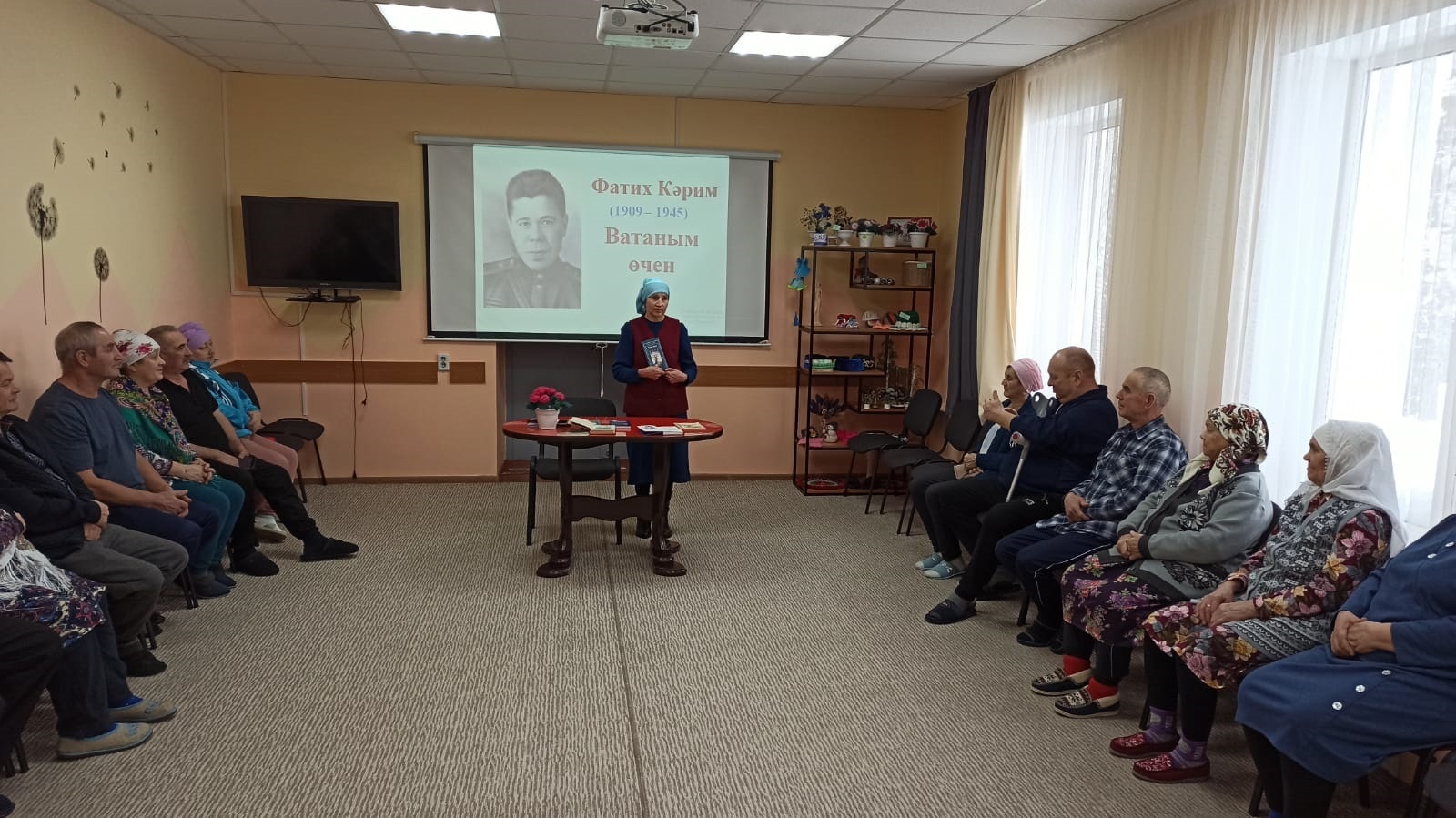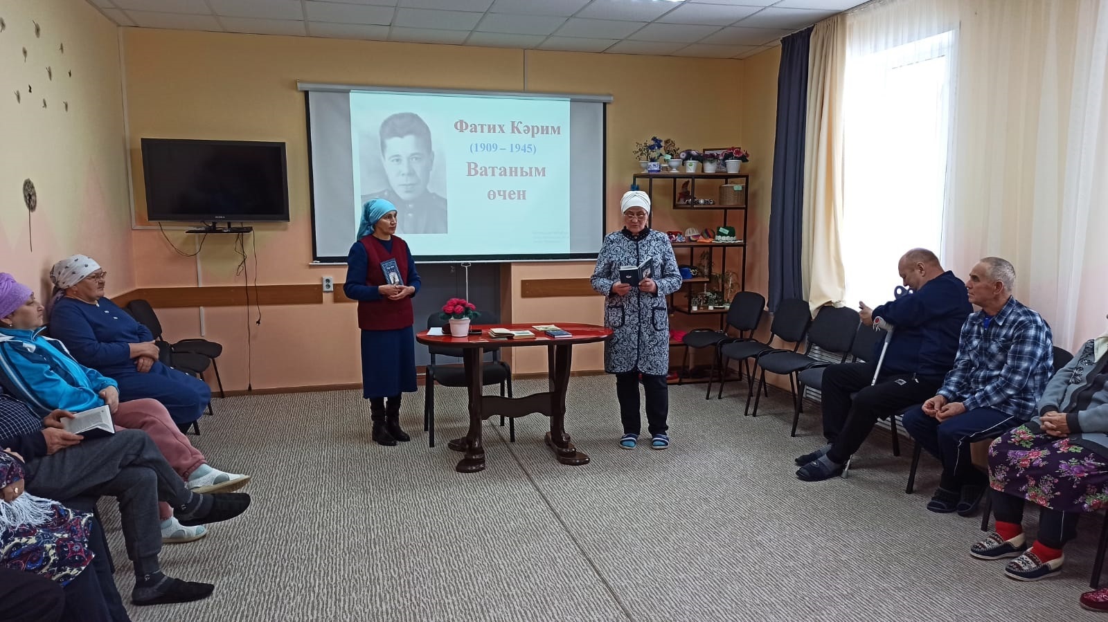 17 гыйнвар көнне уку залы китапханәчесе Сәлимова Т.Х., социаль ярдәм үзәге “НАЗ”да ял итүче пенсионерлар өчен, совет чоры татар поэзиясенең күренекле вәкиле Фатих Кәримнең (Фатих Әхмәтвәли улы Кәримов) тууына 115 ел тулу уңаеннан “ Синең гомерең – илең өчен яну” дип исемләнгән әдәби сәгать үткәрде.